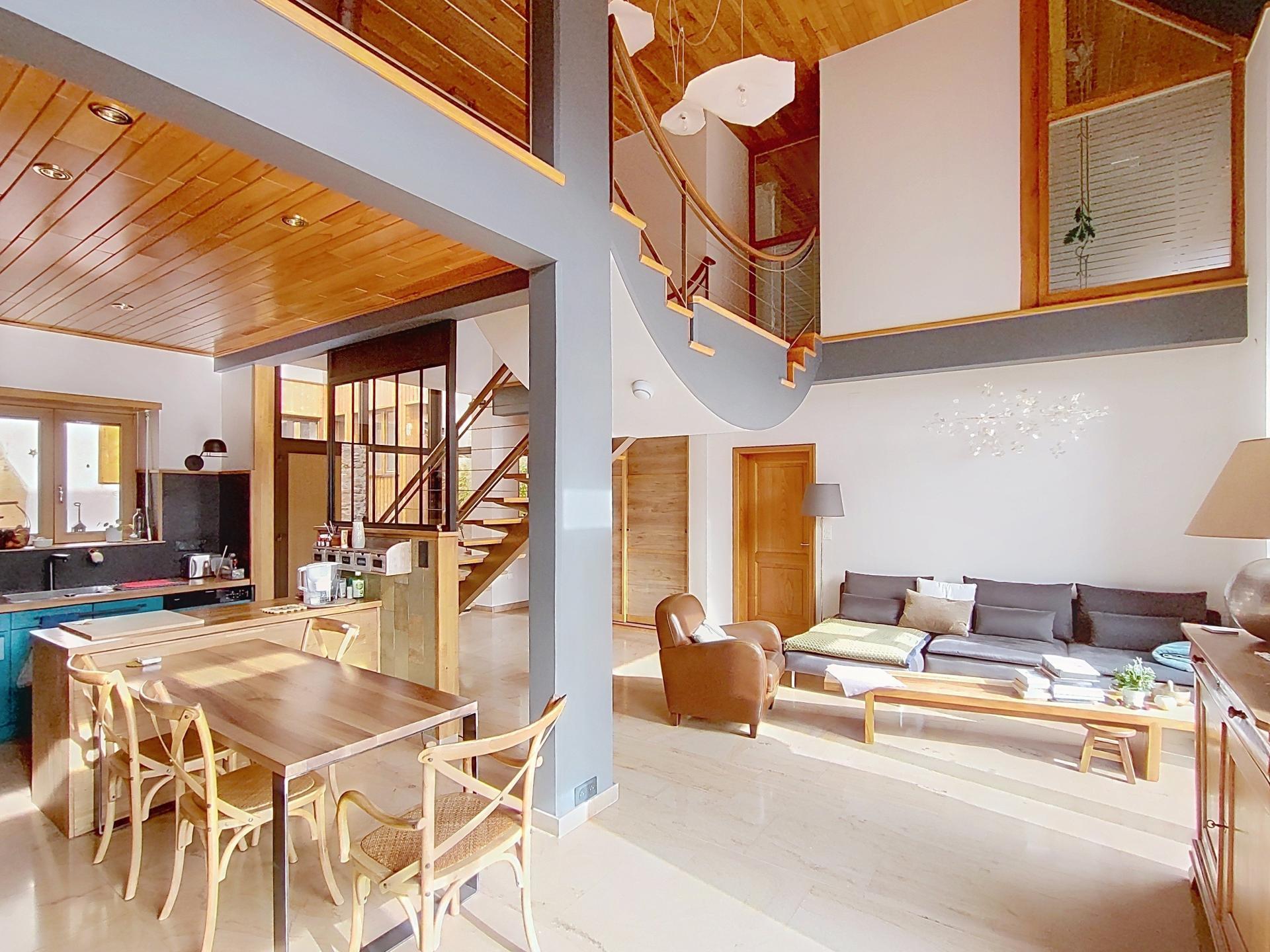A l’étage, une mezzanine de 13,5 m² et une deuxième suite avec dressing et salle d’eau qui totalise 27 m² sont desservies par un remarquable escalier aérien qui vous accueille en pénétrant dans la maison.