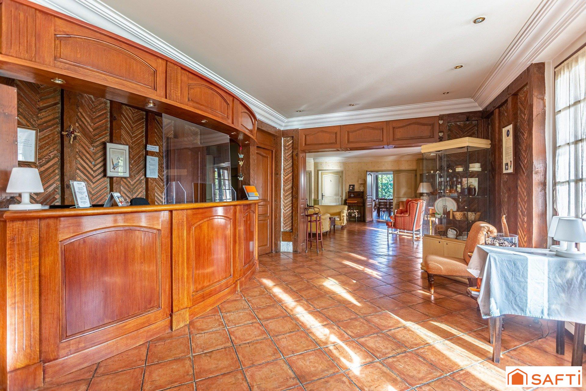 Actuellement en activité, ce lieu d'exception ouvre ses portes sur une agréable réception avec un salon d'attente lumineux et chaleureux. De part et d'autres, on découvre un bar restaurant de 60 m2 où sont proposés aux hôtes les repas et petits déjeuners ; de l'autre, une vaste salle de restaurant de 160 m2 avec tomettes au sol, poutres anciennes apparentes et une cheminée ouverte et traditionnelle en garluche.