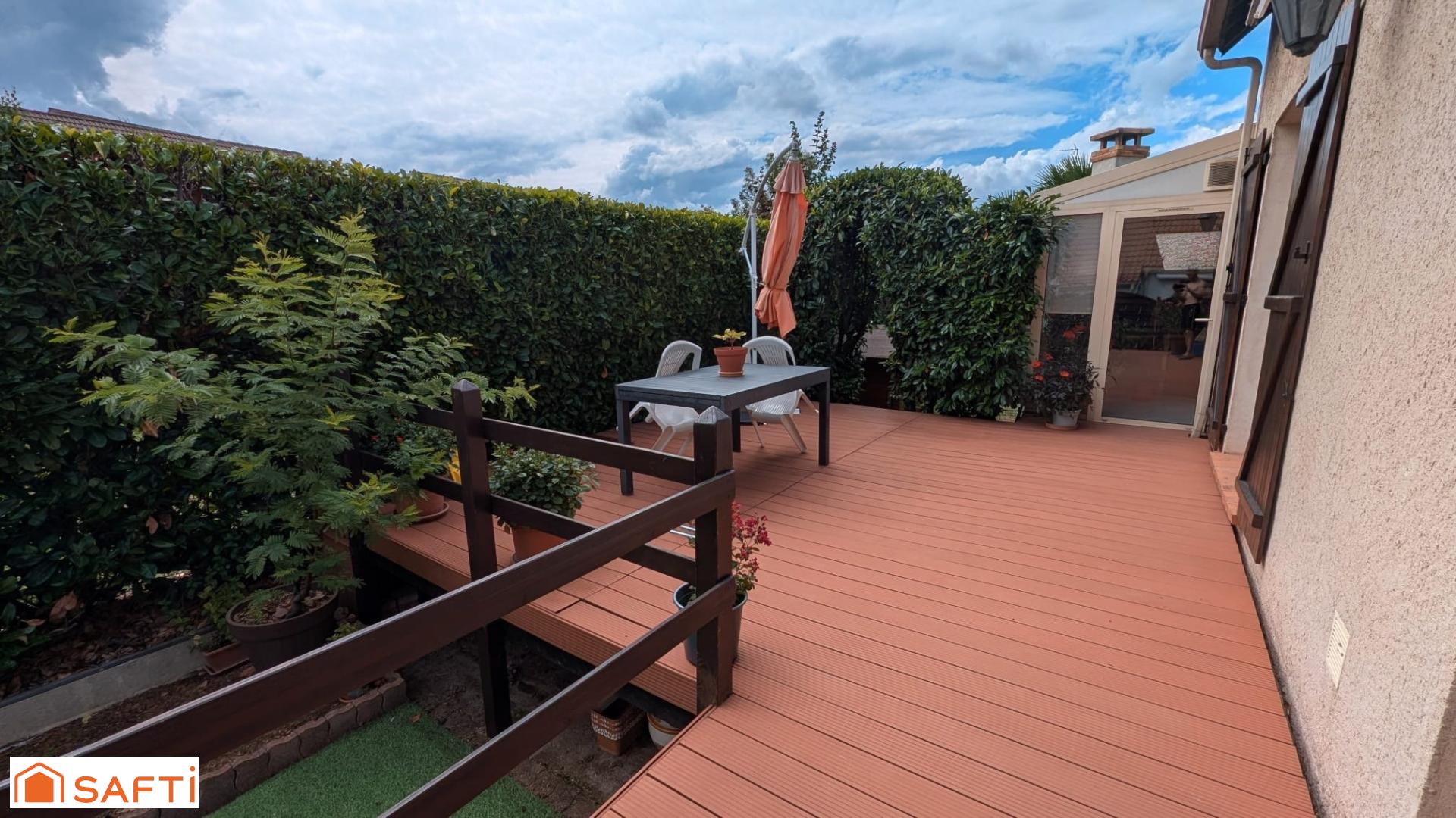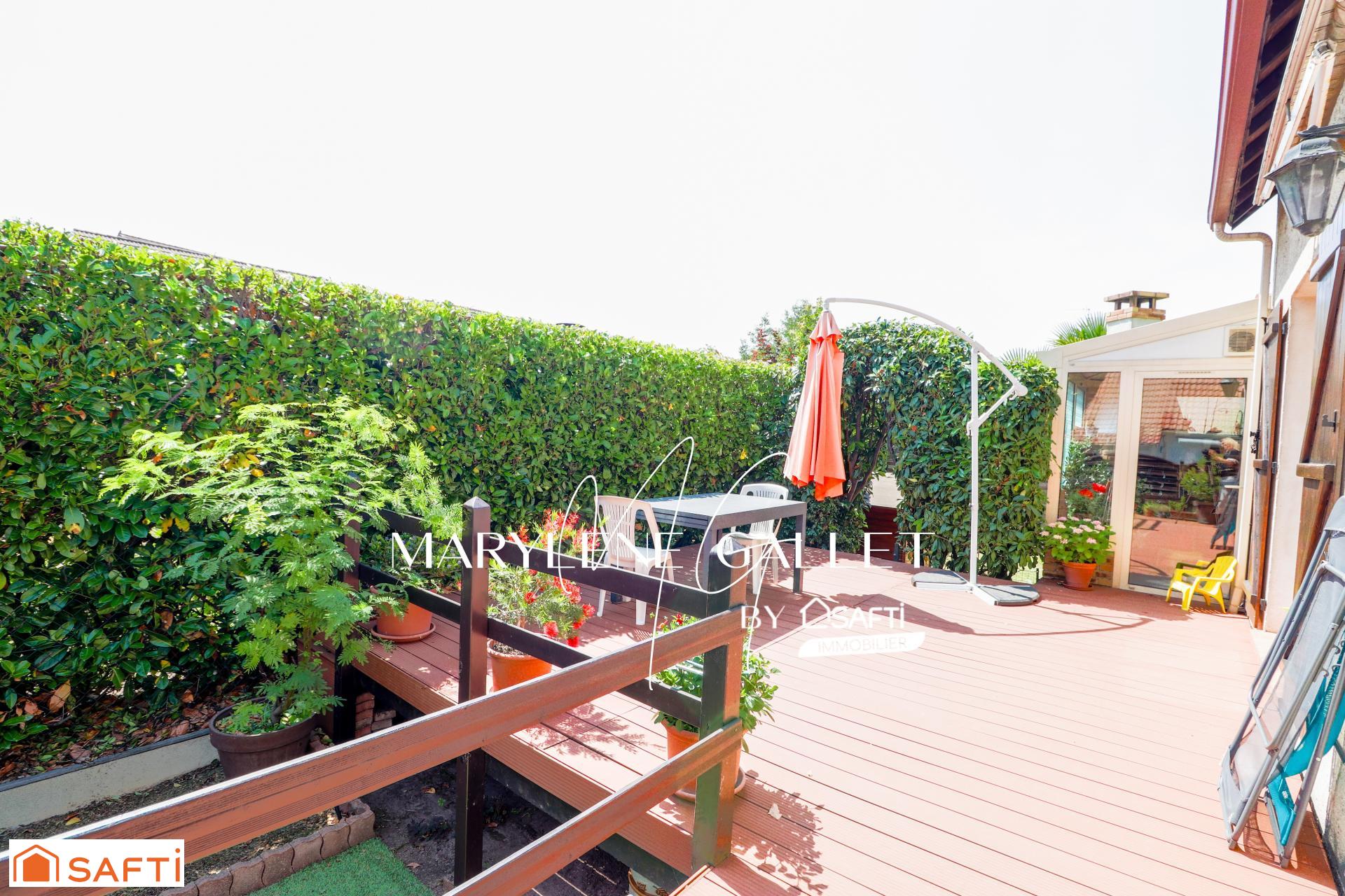 À l'extérieur : BELLE TERRASSE à l'abri des regards en composite accessible depuis la cuisine, le séjour et la véranda, store ban, JARDIN, CABANON et abri vélos. Vous saurez également apprécier l'exposition Sud/Ouest.