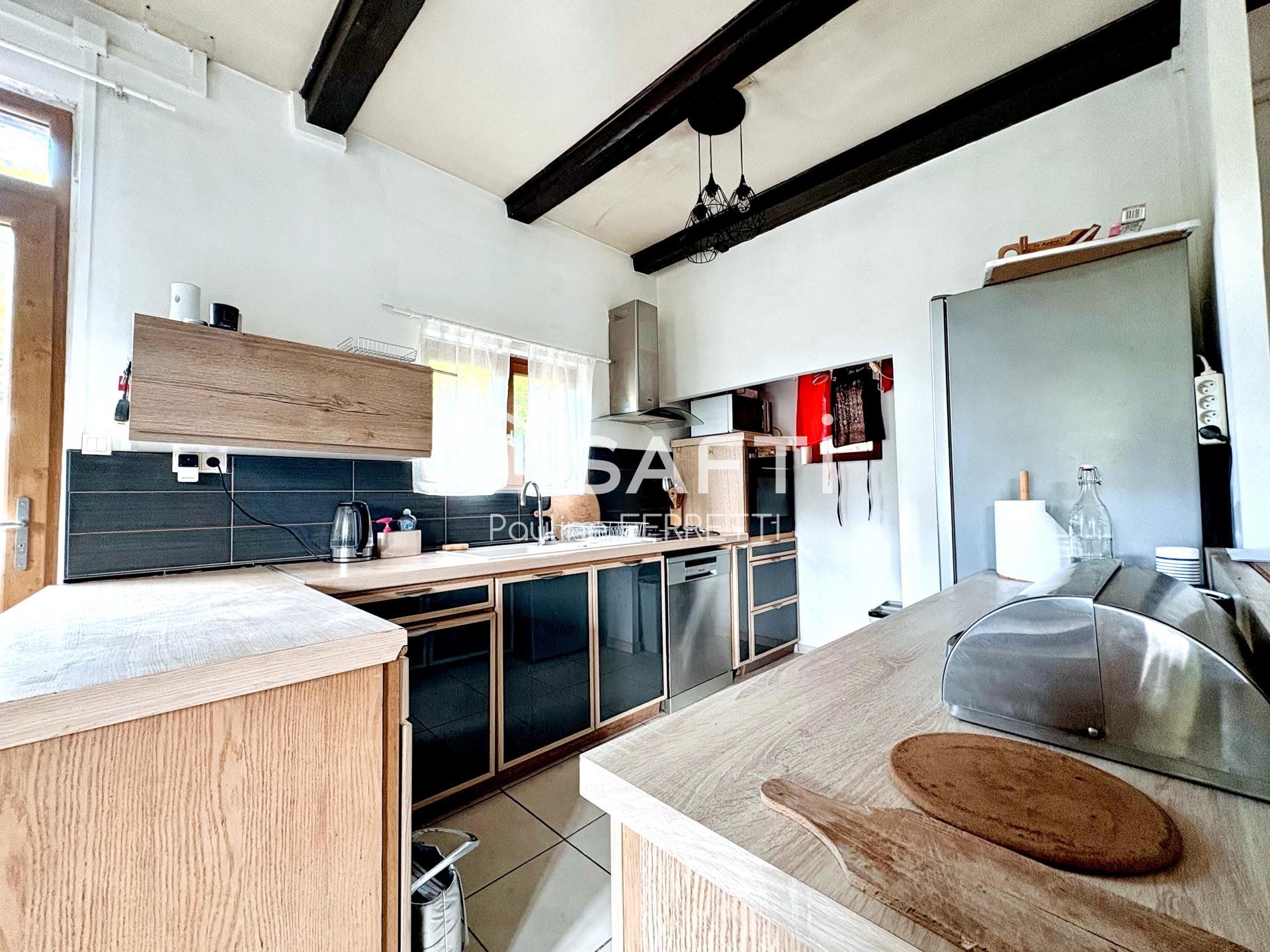 - Cuisine équipée ouverte, 3 chambres, salle d’eau, WC séparé, cellier,