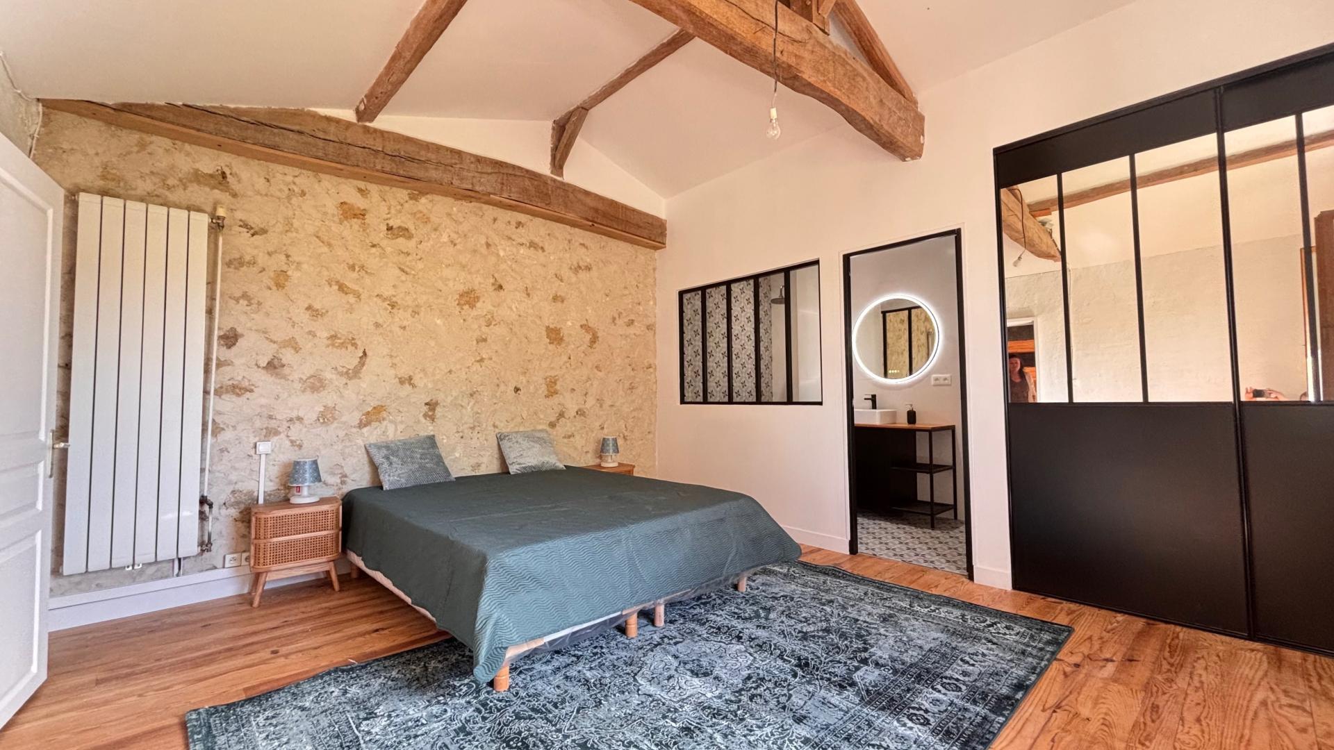 La seconde maison dispose d’un séjour, d’une chambre, d’une salle d’eau avec WC, et à l’étage, une chambre et une mezzanine, parfaite pour de la location ou un accueil indépendant.