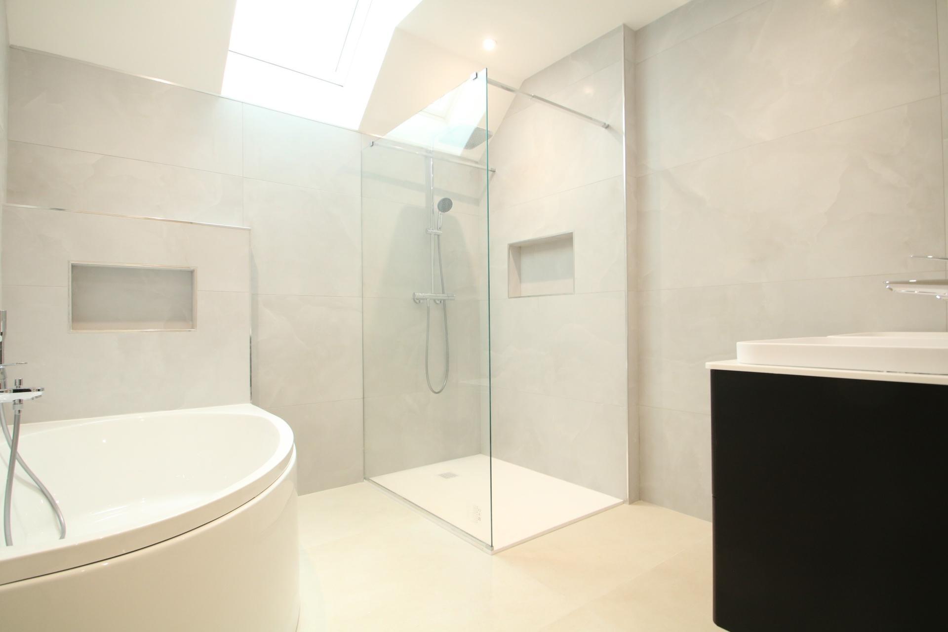 À l’étage, trois chambres spacieuses avec emplacements pour placards sont accompagnées d’une belle salle de bain familiale, avec baignoire et douche.