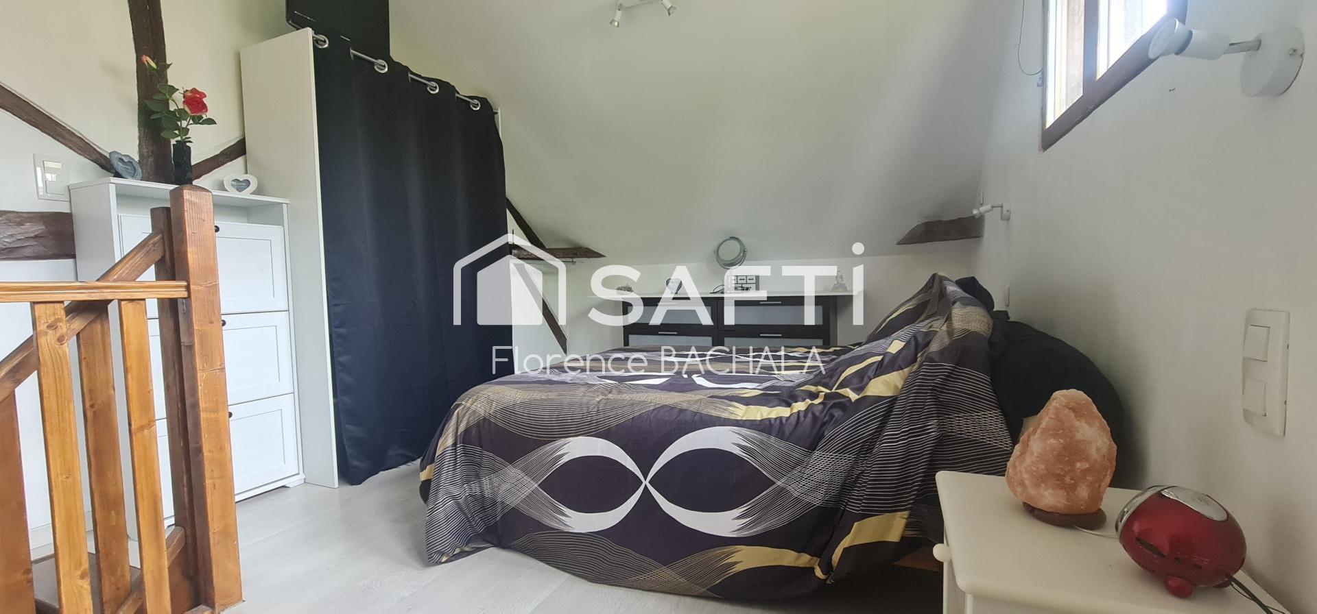 Une partie aménagée en appartement, possède une chambre en mezzanine, 1 cuisine aménagée et un séjour, l'autre est restée en grange avec un garage et possède un gros potentiel d'aménagement.