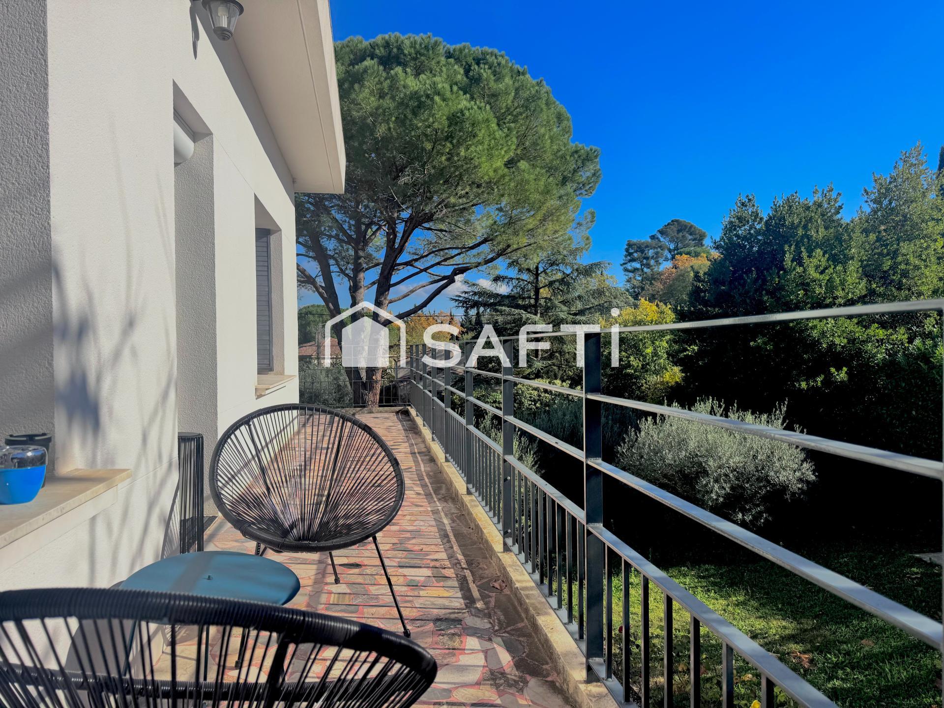 Maison individuelle de 185 m² sur 1 520 m² de terrain, en très bon état, avec piscine, balcon, parking et cave, proche du centre d’Aix.