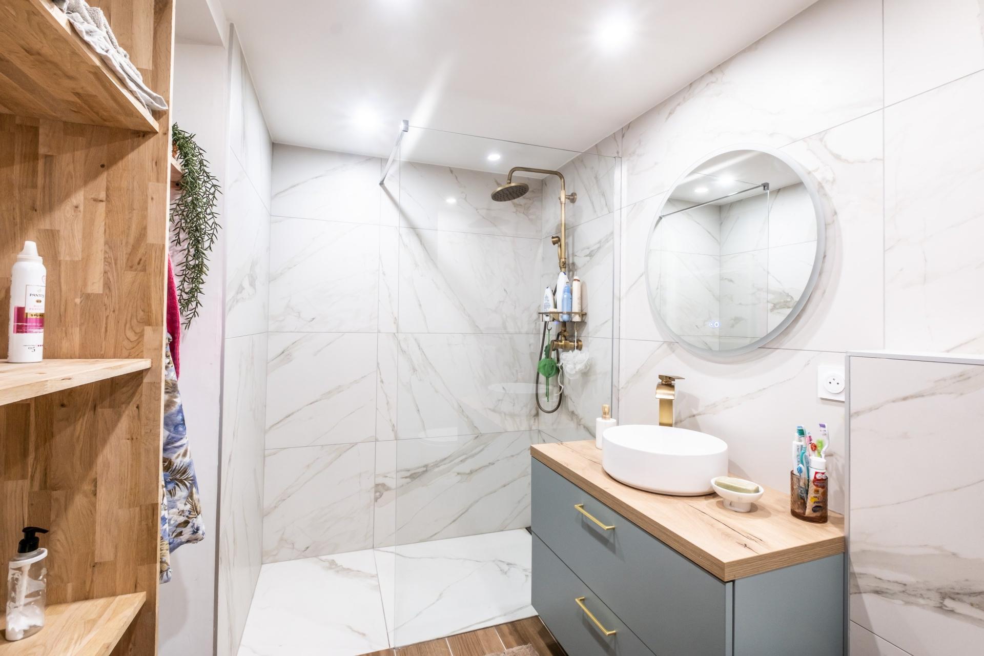 Au rez-de-chaussée, une pièce de vie d’environ 30 m² accueille une cuisine ouverte sur le séjour, sublimée par un parquet en chêne massif. Ce niveau donne accès directement à une grande terrasse, idéale pour partager des moments conviviaux en famille ou entre amis.