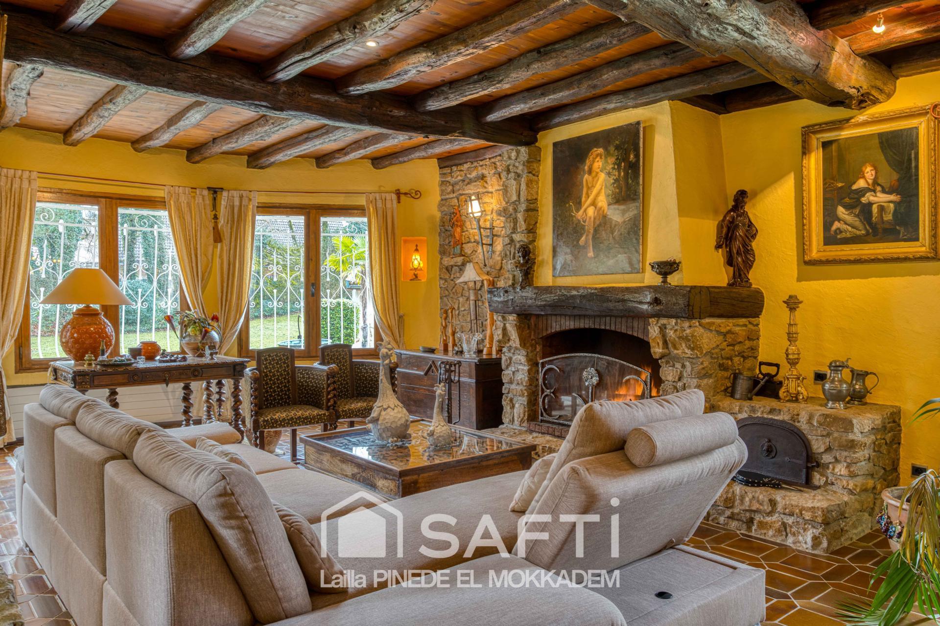 Les poutres apparentes, la pierre, le poêle et la superbe cheminée créent un ensemble harmonieux, élégant et plein de caractère.