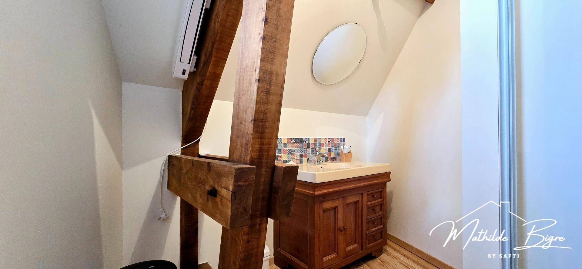 Les combles aménagés réservent un espace nuit cosy avec deux grandes chambres, une salle d’eau moderne et des WC indépendants. L’authenticité du lieu a été préservée avec une charpente apparente, qui donne à la maison un charme unique, mêlant l’ancien et le contemporain.