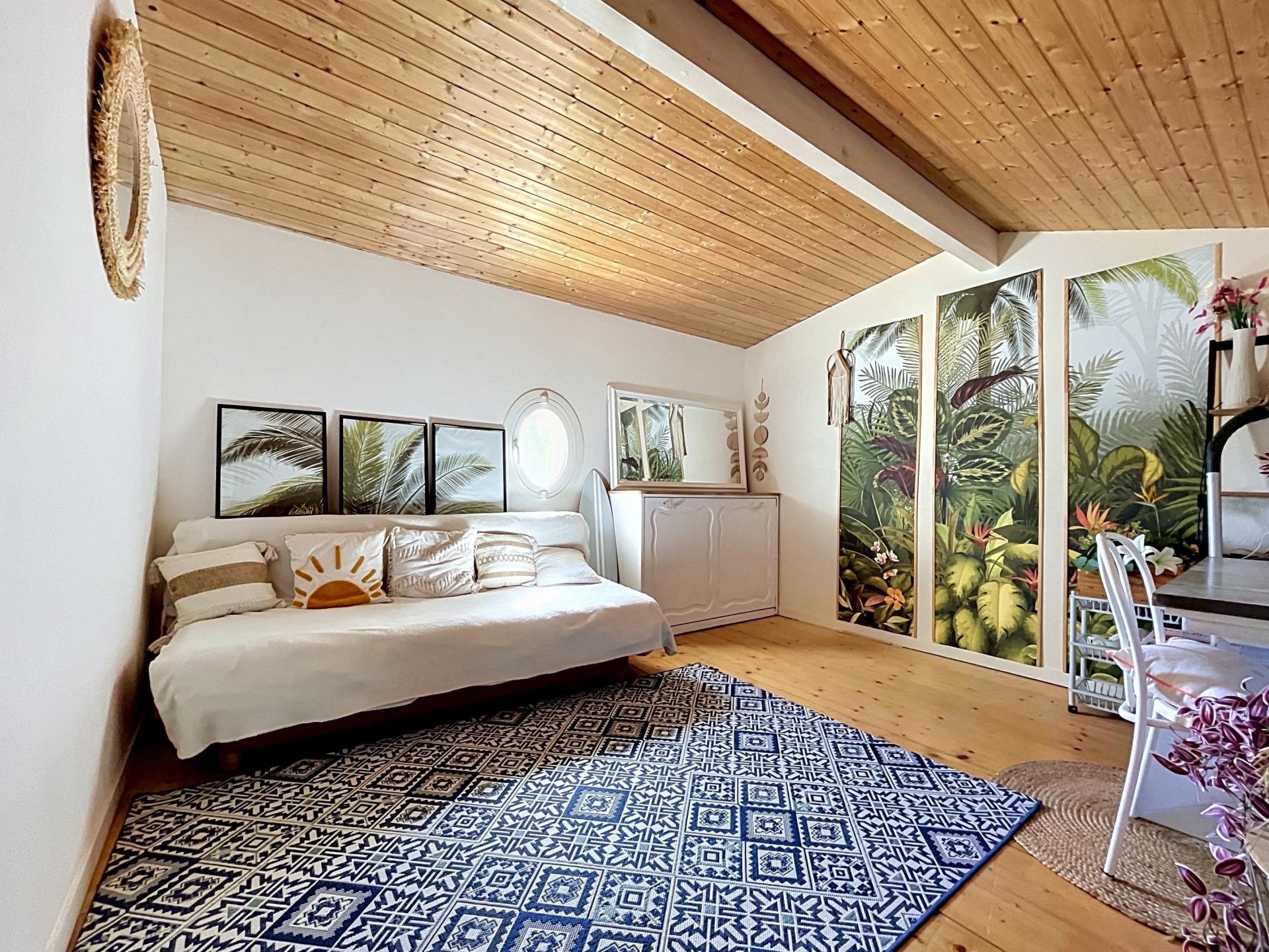 Vous accéderez par un 2ème escalier à chambre mansardée qui ne manque ni de volume ni de charme (12,5 m2).