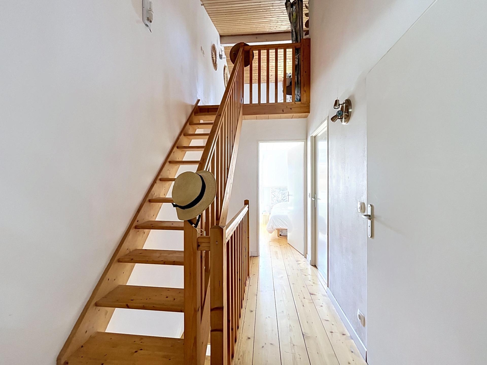 Un bel escalier bois vous amène au 1er étage qui se compose de 2 chambres (un peu plus de 11 m2 chacune), d'une salle de bains et d'un WC séparé.