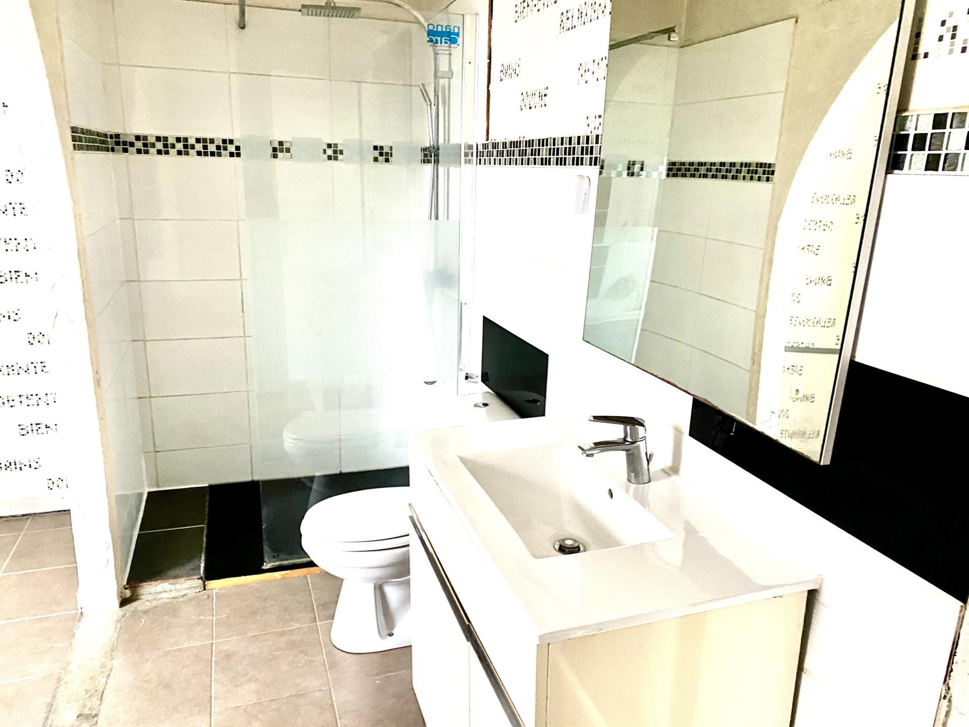Une salle de bain moderne avec baignoire et douche à l’italienne , un radiateur sèche-serviettes, WC, complètent ce niveau.