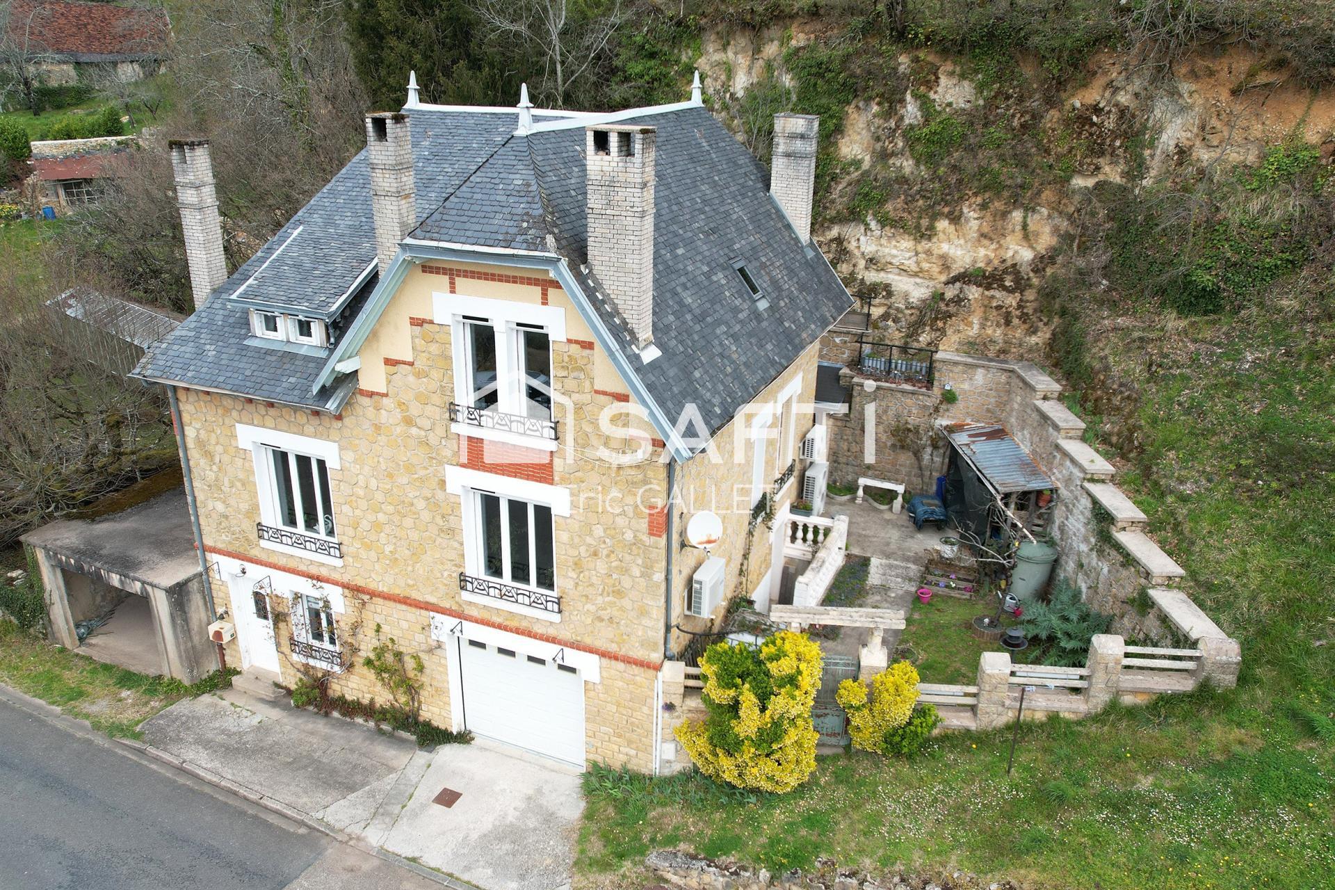 À l'extérieur, cette maison de caractère se distingue par sa façade en pierre et sa toiture en ardoise. Une terrasse accueillante et un garage ajoutent une dimension pratique à ce bien.
