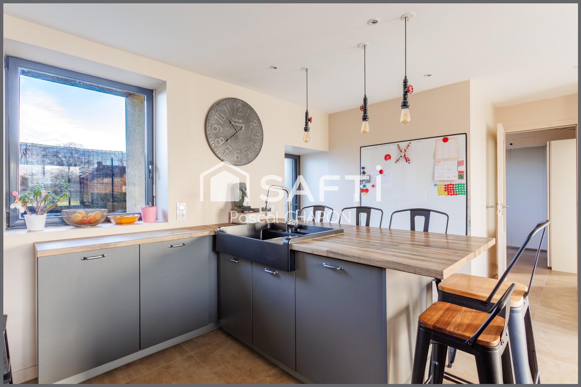 Au rez-de-chaussée, la pièce de vie s’organise autour d’une cuisine contemporaine avec îlot central, idéale pour partager des moments conviviaux. Le séjour chaleureux est sublimé par un poêle à bois qui crée une ambiance douce et réconfortante. Une suite parentale permet de profiter d’une véritable vie de plain-pied, complétée par une buanderie et un wc pour plus de praticité.