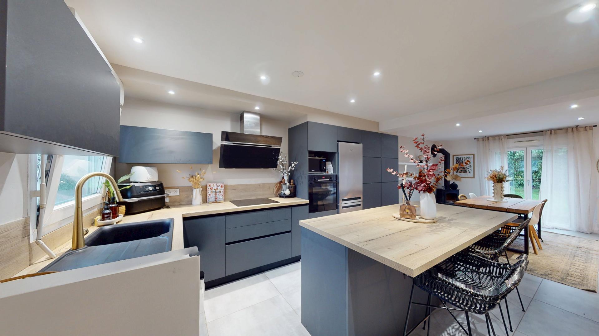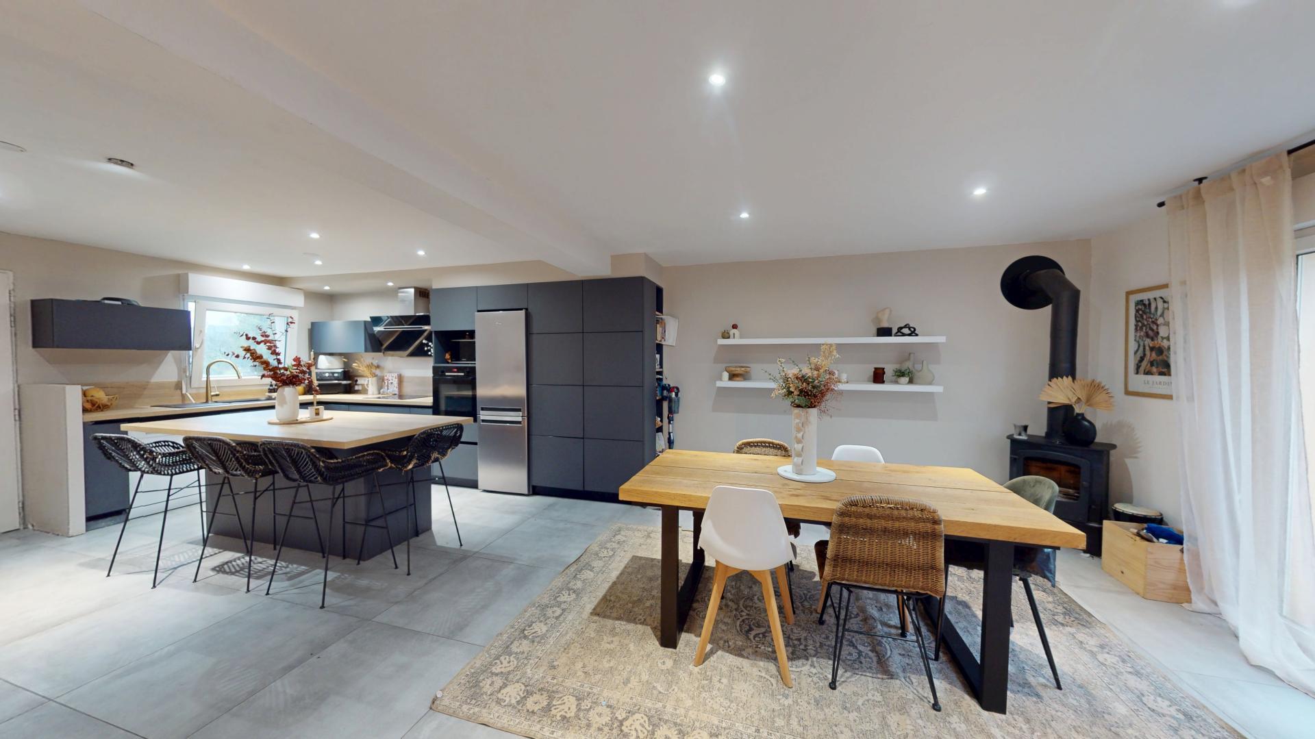 Celle-ci est composée au rez-de-chaussée d'une belle cuisine aménagée-équipée ouverte sur le salon-séjour avec poêle à bois et accès terrasse exposée plein Sud.