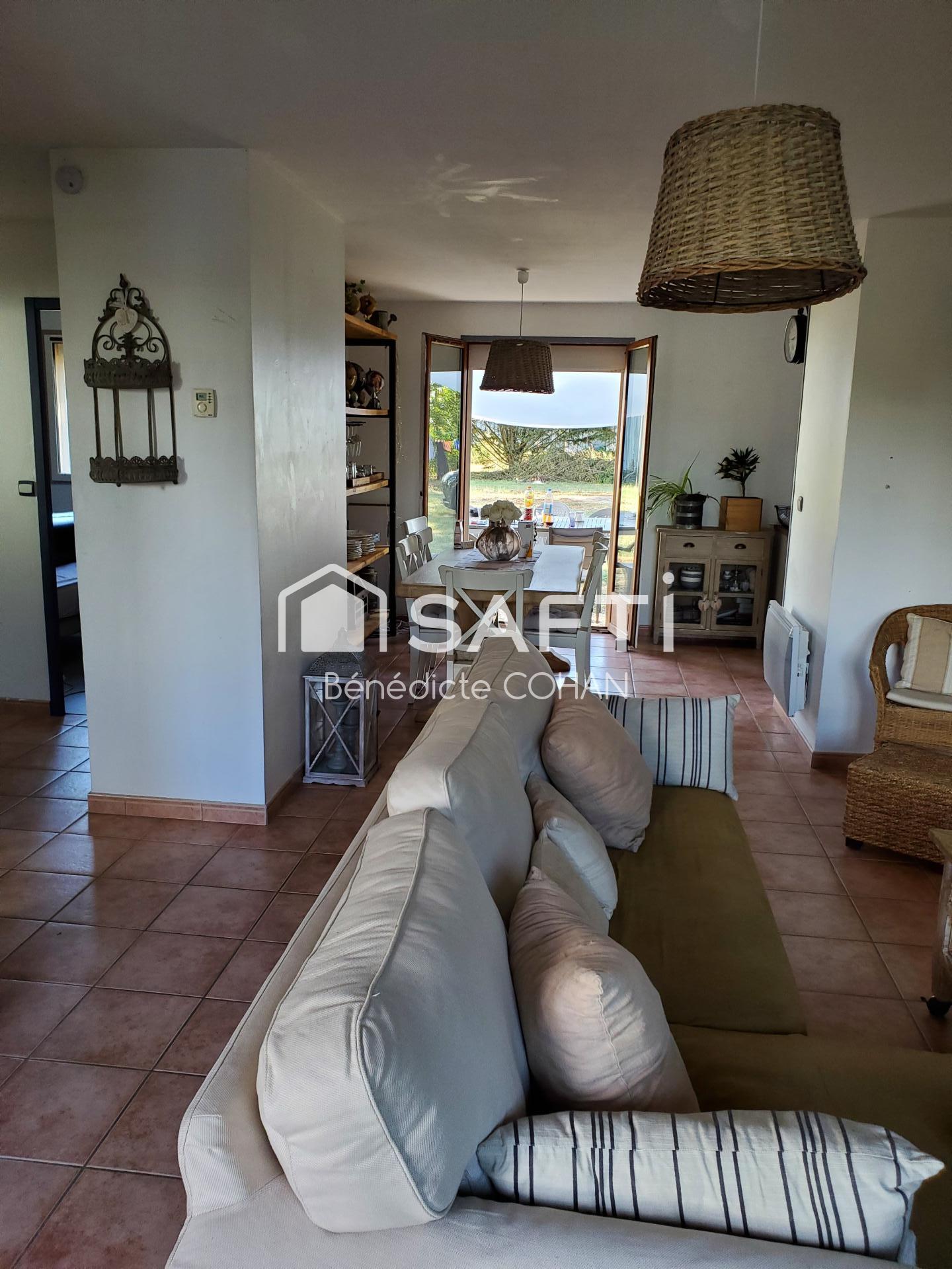 Vous pourrez profiter d'une salle à manger/salon, d'environ 32 m2 avec un poêle à bois, ouvert sur la cuisine aménagée, lumière traversante. Depuis la salle à manger, et la cuisine vous accèderez a la magnifique terrasse( 68 m2) avec cuisine d'été et pergolas.