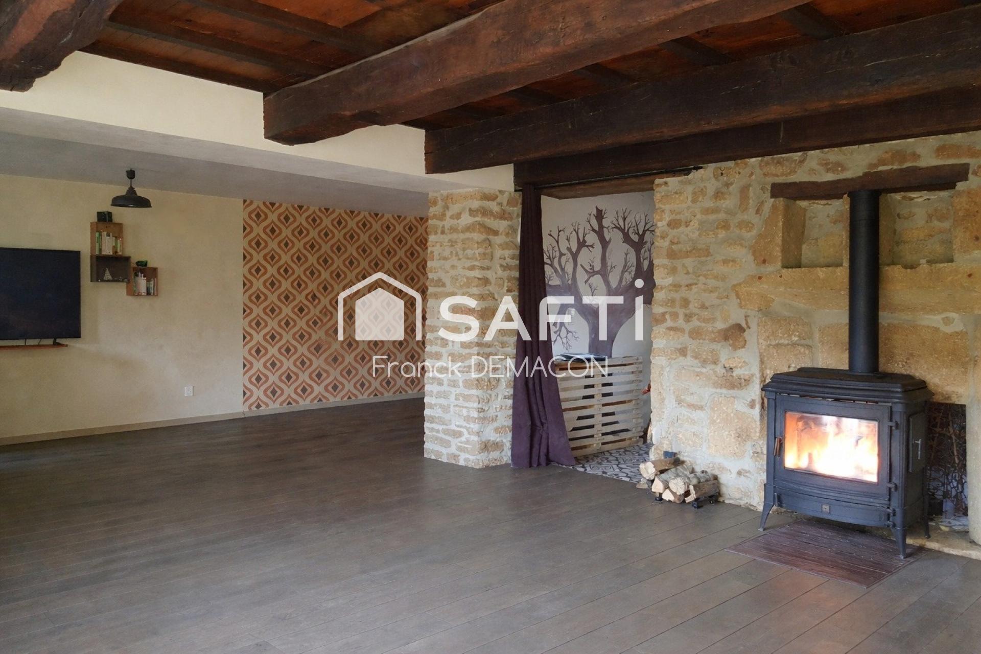 Dès l’entrée, la propriété révèle toute son identité : murs en pierre apparente, poutres d’origine et une remarquable cheminée en pierre de taille confèrent à l’ensemble une atmosphère chaleureuse et intemporelle.