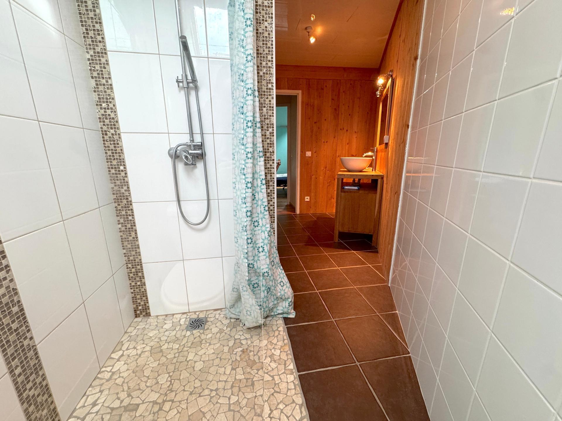- Rez-de-jardin: Hall d'entrée, cellier, cuisine donnant sur terrasse, salon, salle de bains avec WC.