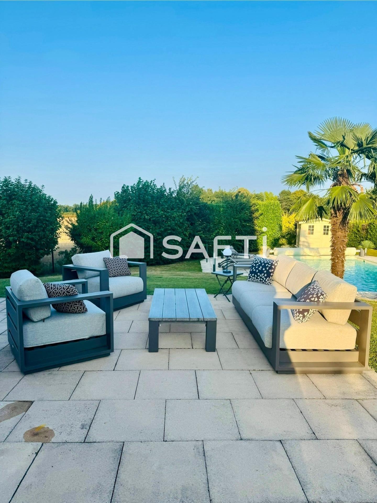 Les portes-fenêtres s'ouvrent naturellement vers un jardin paysager soigneusement entretenu.Sur votre droite, la piscine s'intègre harmonieusement à l'ensemble, offrant un espace de détente privilégié, à l'abri des regards.