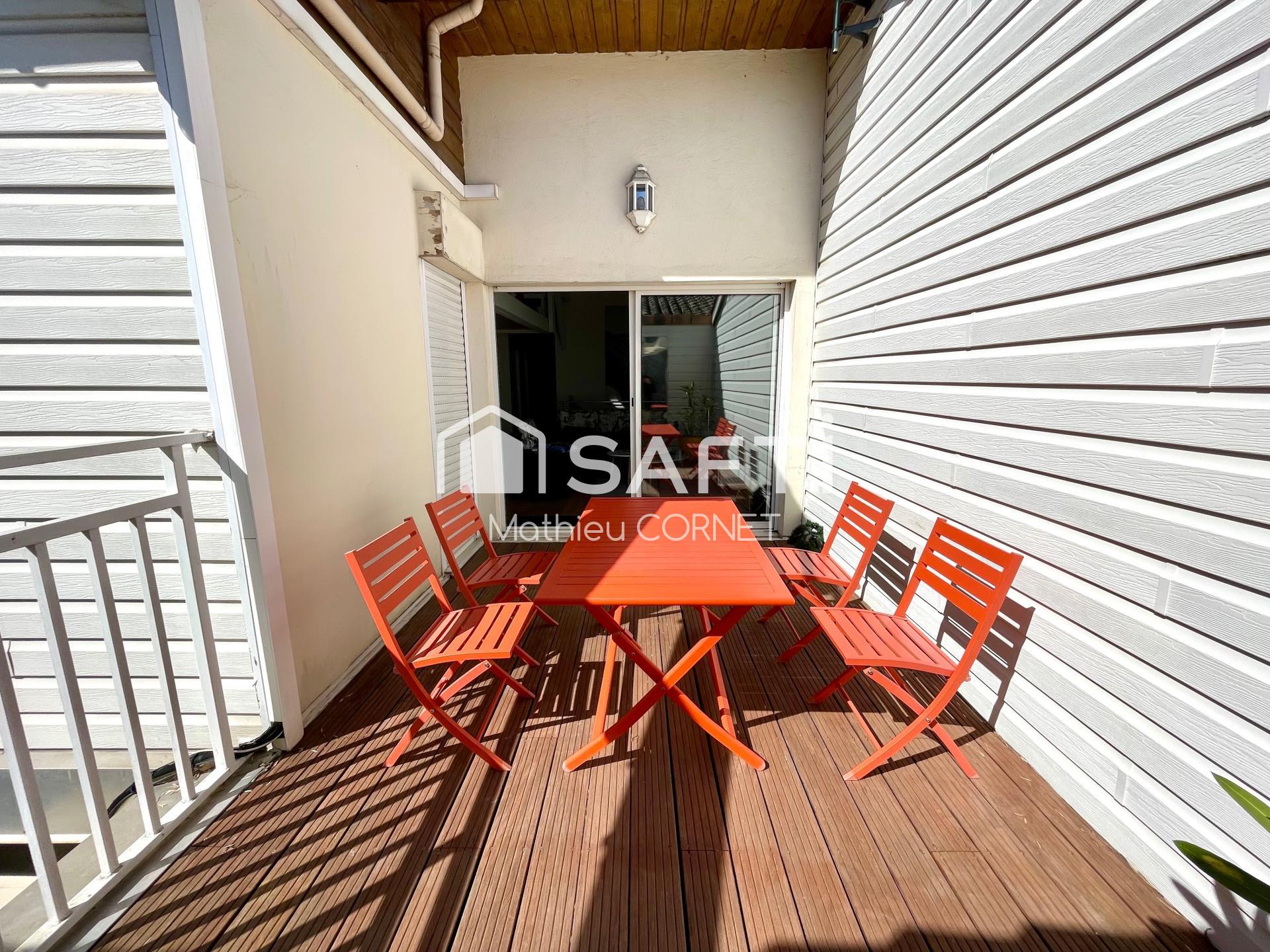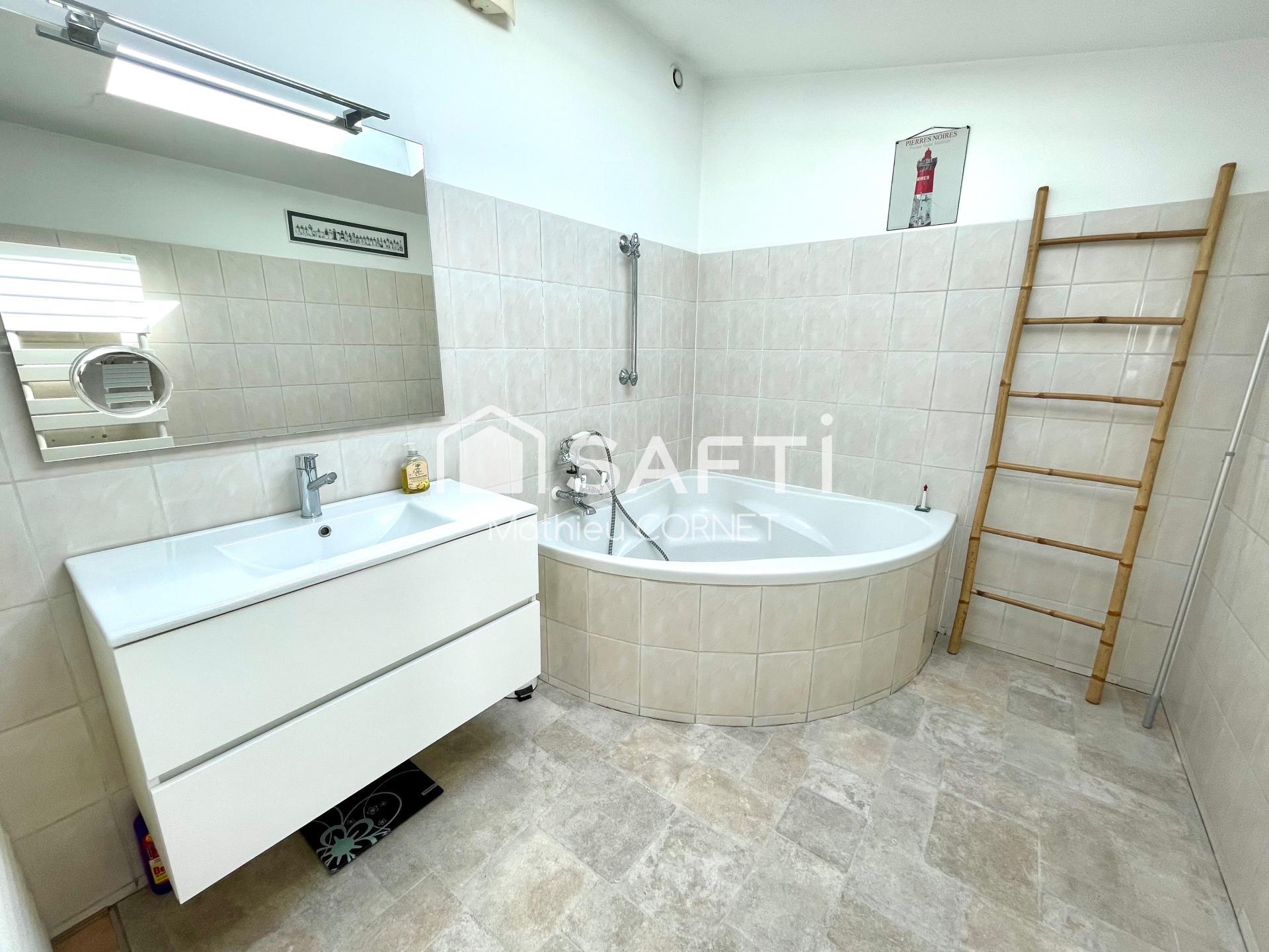 À l'étage, une vaste pièce de vie s'ouvre sur une cuisine et une terrasse, complétée par une suite parentale avec salle de bains attenante, un WC et un cellier. Une mezzanine vient parfaire ce bien.