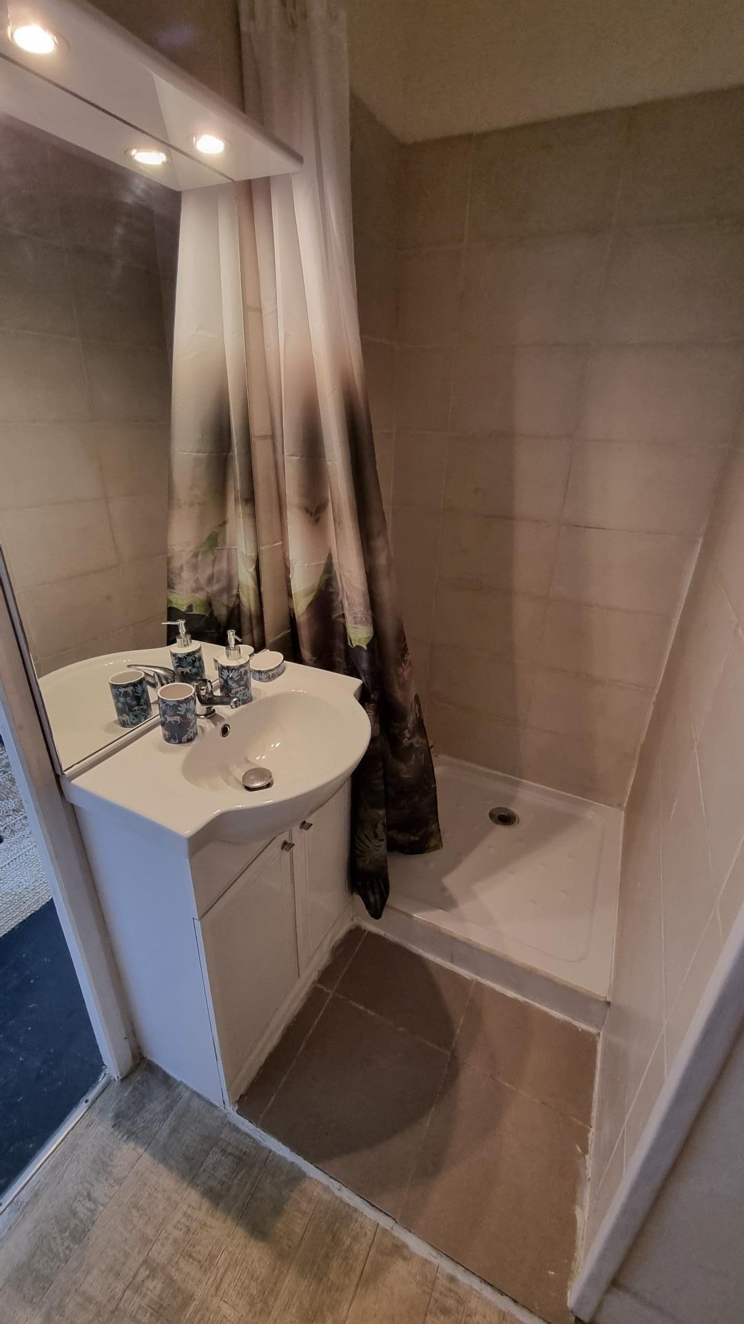 A l' étage un appartement F2 avec un salon ,une cuisine,une chambre et une salle d' eau avec wc.