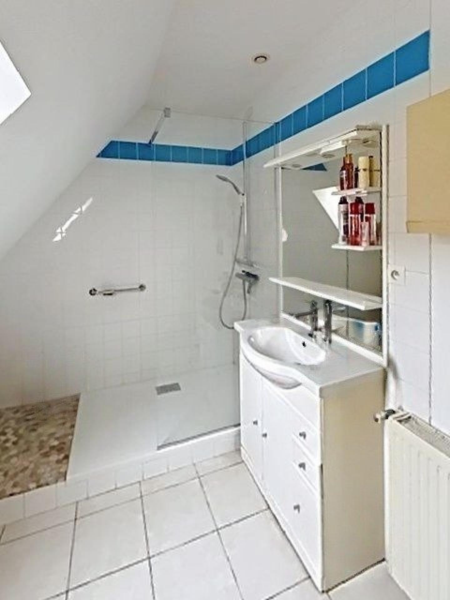 À l’étage, un palier avec placard mène à deux belles chambres, ainsi qu’à une belle salle d’eau.