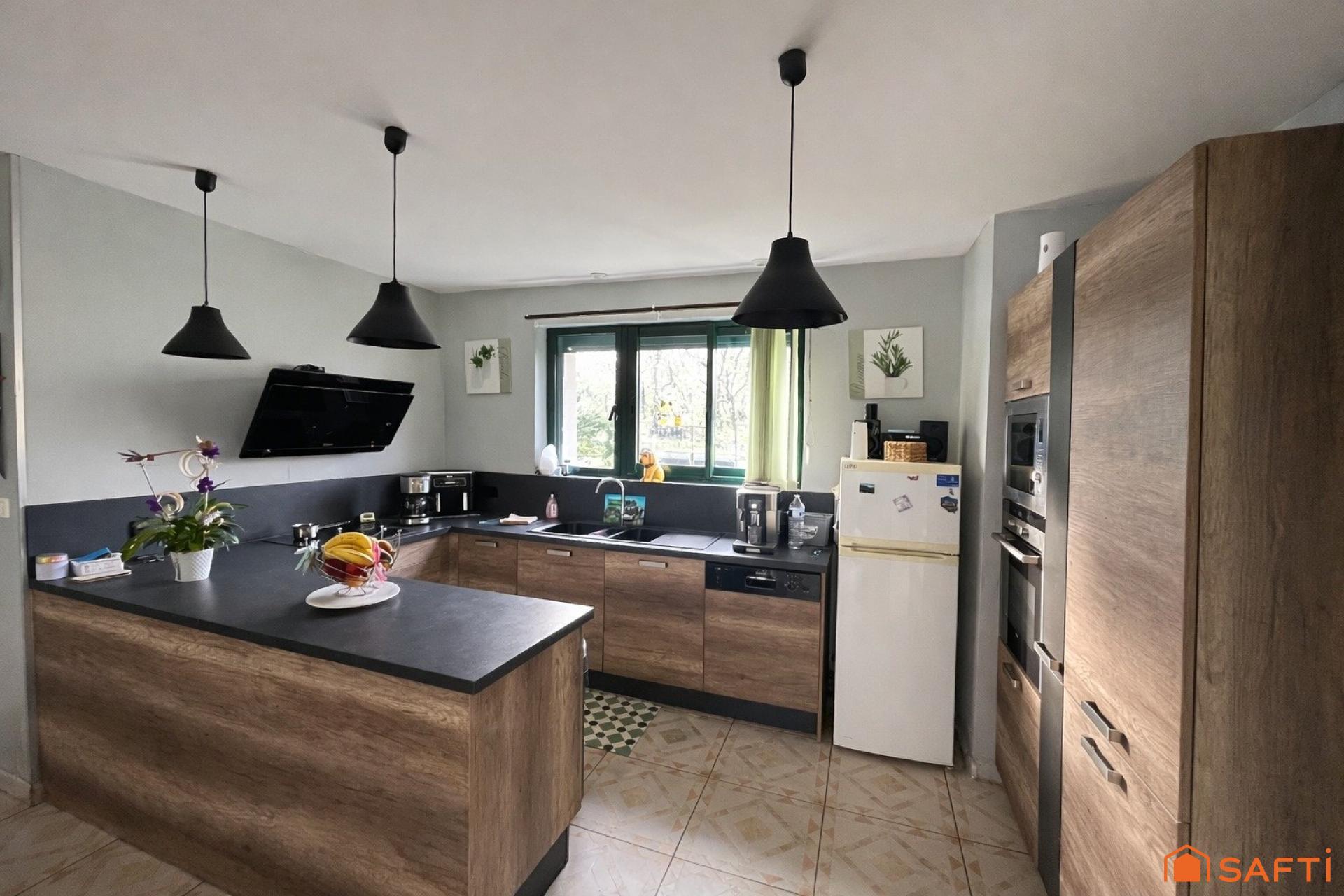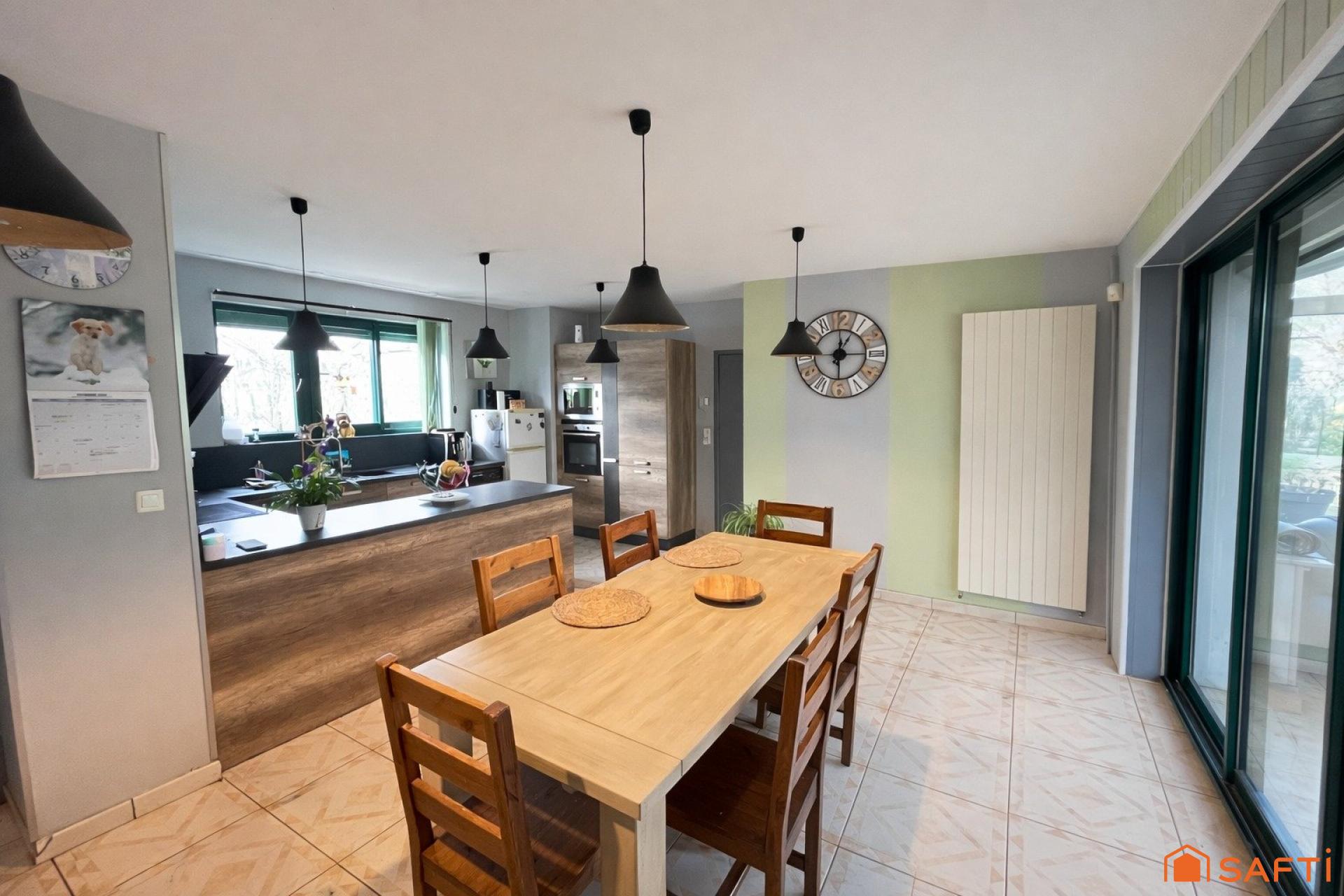 Dès l’entrée, vous découvrez une spacieuse pièce de vie de 45 m² comprenant une cuisine ouverte sur la salle à manger, ainsi qu’un espace complémentaire sur le côté, idéal pour un coin bureau ou un espace détente. À l’arrière de la cuisine, un cellier vient compléter cet ensemble fonctionnel.
