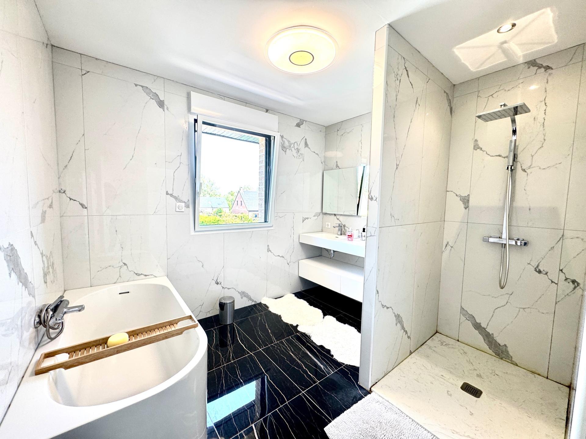-A l'étage, sur dalle béton: une mezzanine ( espace jeu ou bureau à votre convenance), 3 chambres avec dressing, buanderie et salle de bain contemporaine.
