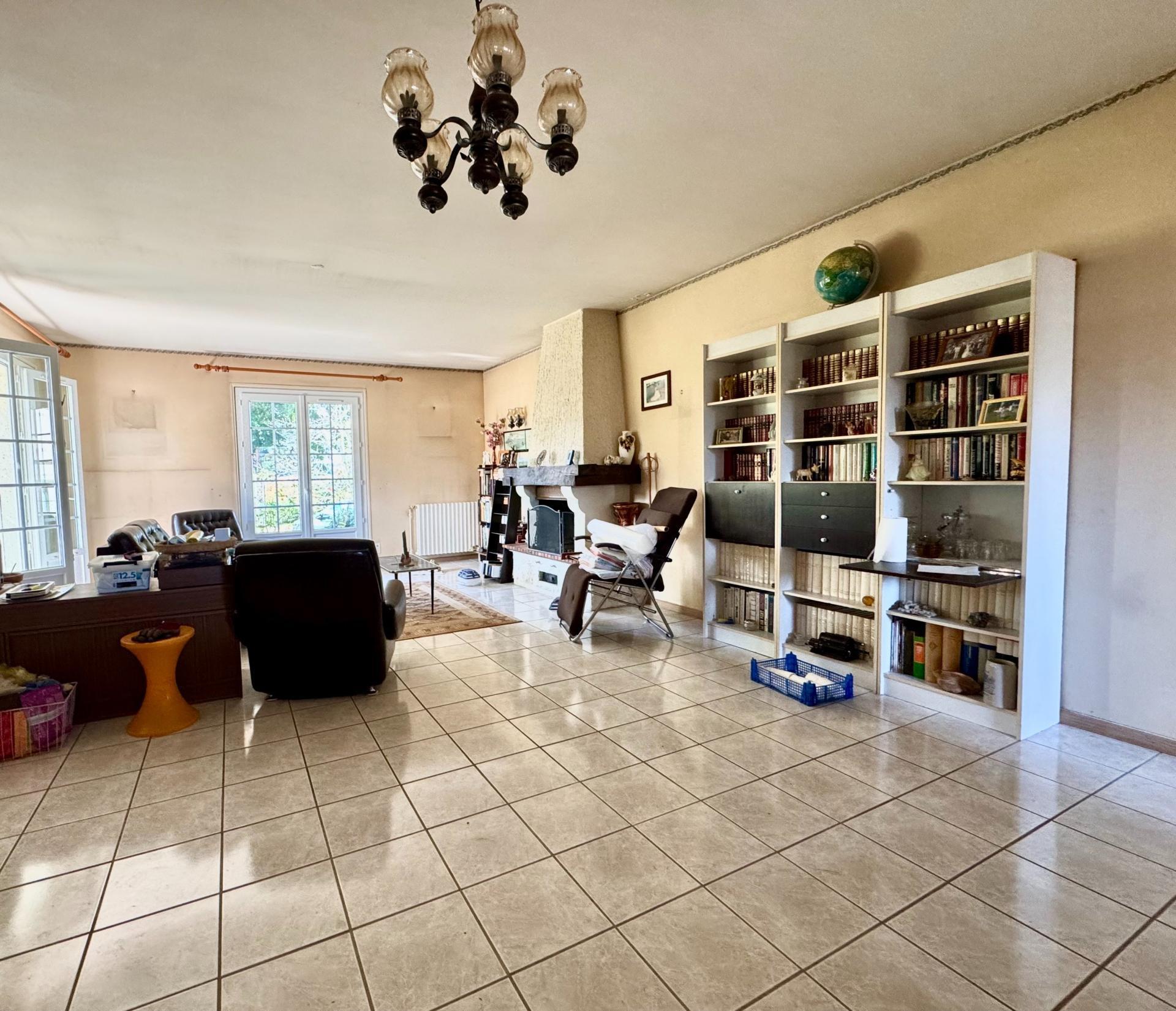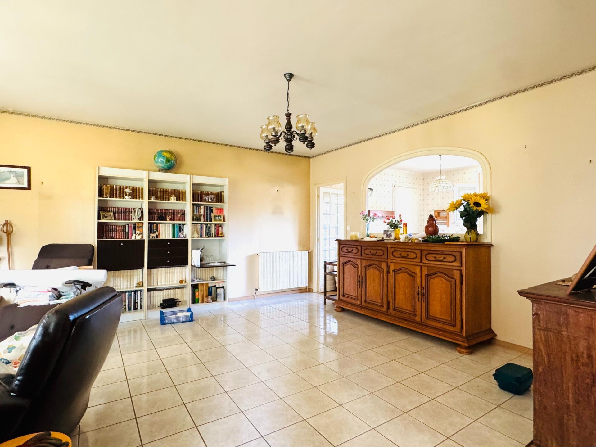 Charmante maison de plain-pied à rafraîchir sur vide sanitaire, comprenant une cuisine équipée semi-ouverte sur le salon/séjour d'env. 30m², cellier de 2.5m², grande salle de bain avec wc et 2 chambres.