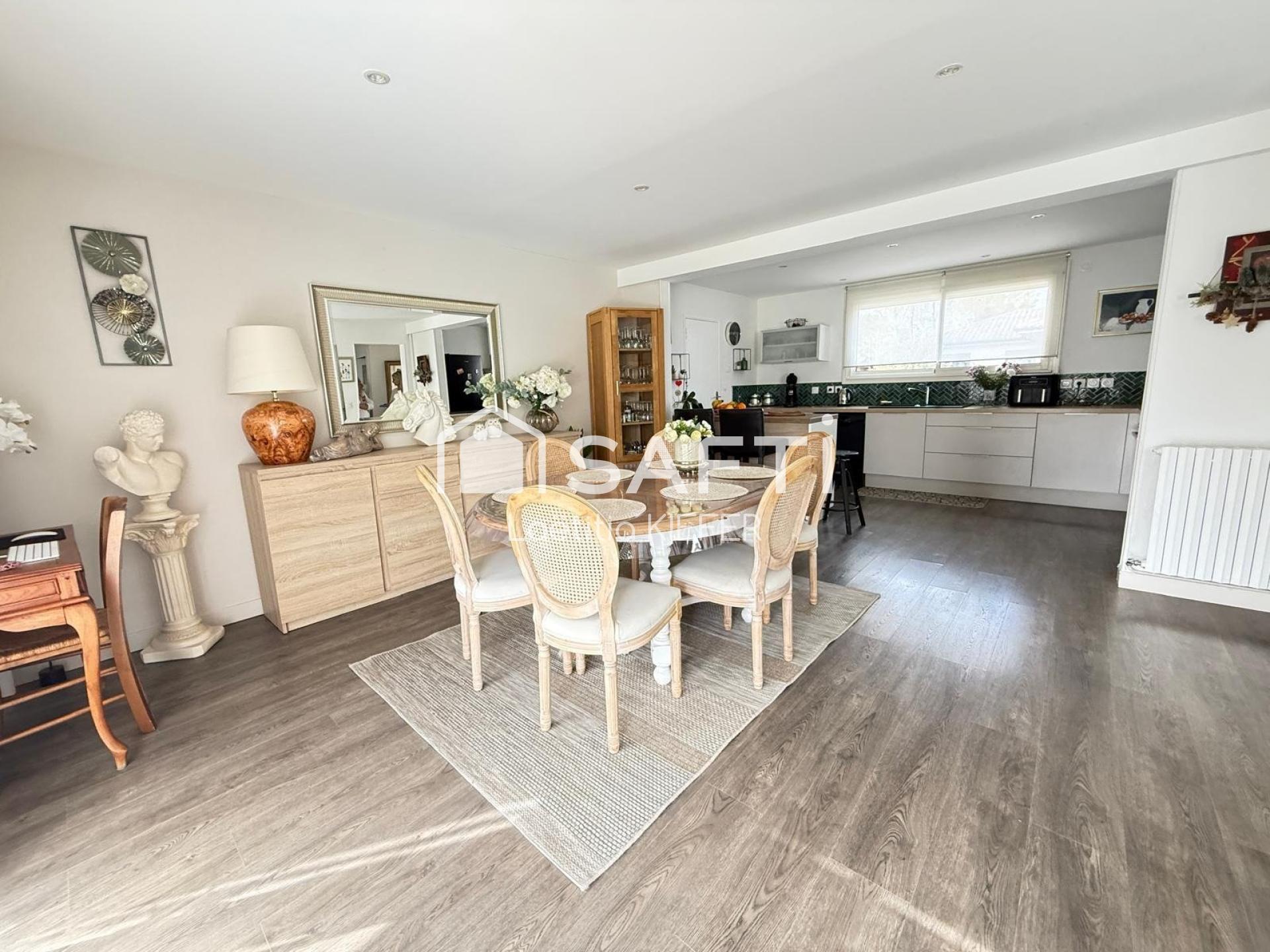 À l’extérieur, le jardin, bien entretenu, propose un cadre agréable avec une piscine, une terrasse en bois et une pergola bioclimatique, permettant de profiter pleinement des beaux jours. Un garage/cellier de 17 m² vient compléter le bien.
