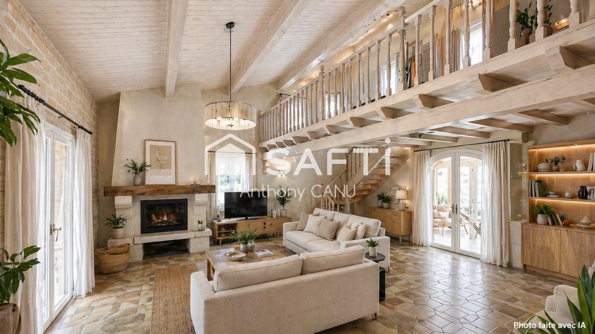 La pièce de vie est spacieuse et fonctionnelle, avec une cuisine équipée ouverte sur les espaces de vie. La maison dispose de 3 chambres confortables, ainsi qu’une mezzanine de 18 m² qui peut facilement être aménagée en bureau de télétravail, salle de jeux ou espace polyvalent selon vos besoins. L’ensemble est complété par une cheminée, une piscine et un double garage, apportant confort et praticité au quotidien.