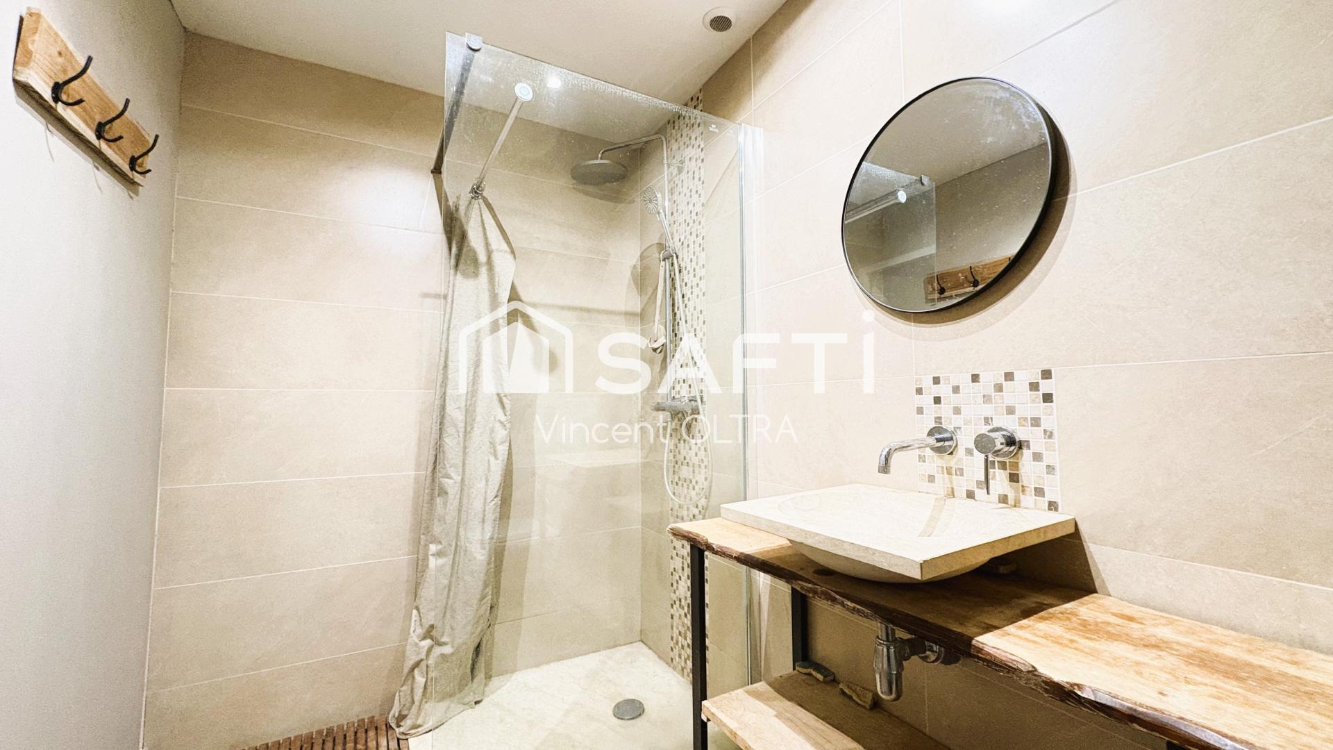 Cachet de l'ancien, tomettes, poutres, pierres apparentes.
