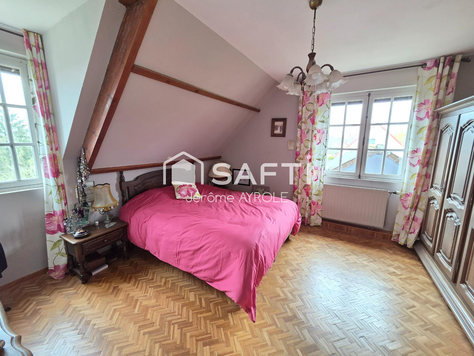 À l'intérieur, cette maison de 132 m², construite en 1983, se compose de 6 pièces incluant 4 chambres (potentiellement 5) dont 2 au rez-de-chaussée, 2 salles de bain dont une au rez-de-chaussée, 2 toilettes, un séjour agrémenté d'une cheminée tubée, une cuisine équipée et une buanderie. La façade en brique confère à la maison un charme traditionnel. L'espace habitable est agencé de façon fonctionnelle, offrant des pièces spacieuses et lumineuses. Cette propriété constitue une opportunité idéale pour une famille à la recherche d'un cadre de vie confortable et harmonieux.