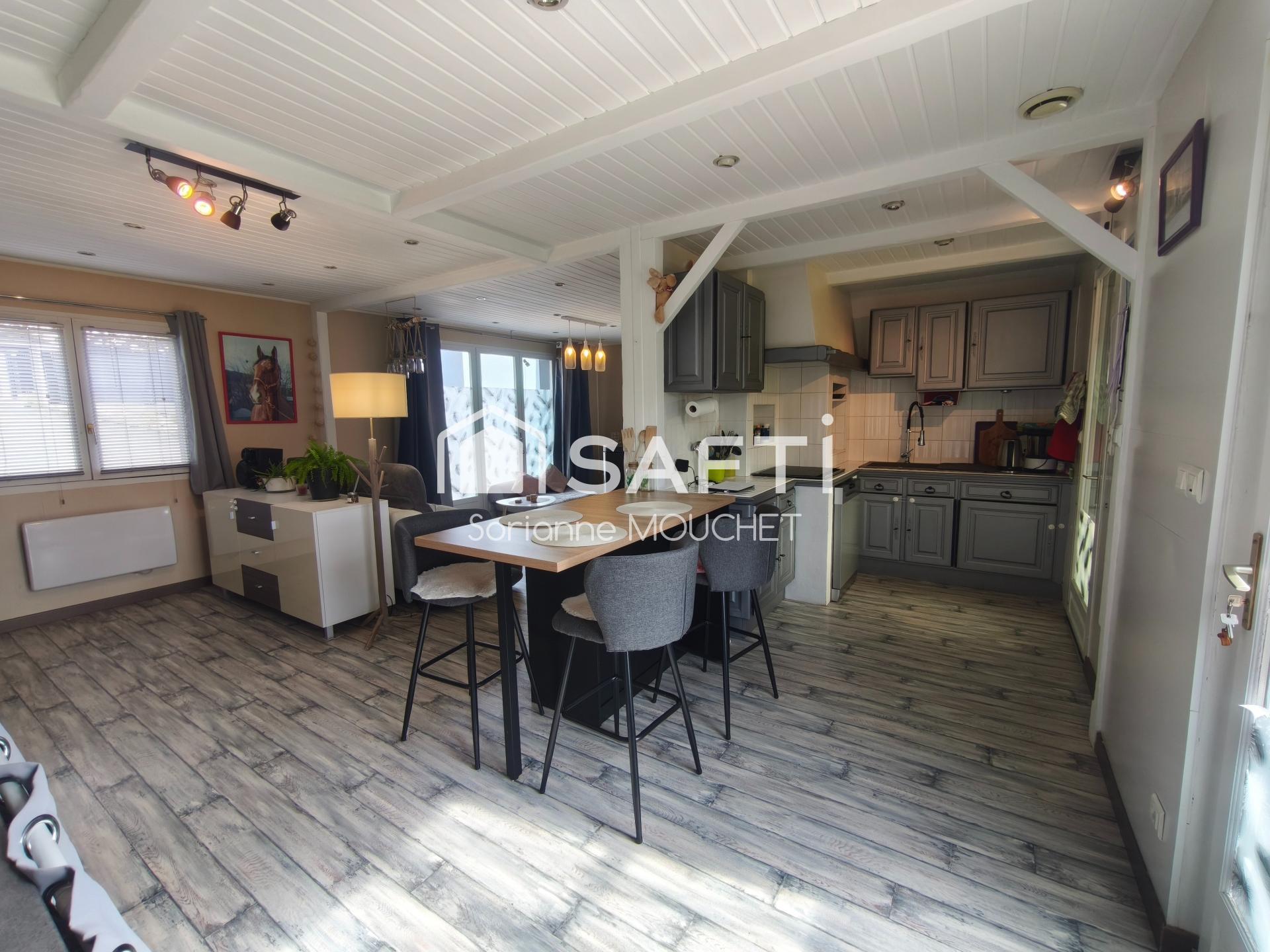 À l'intérieur, cette maison comprend une pièce de vie ouverte lumineuse avec un poêle à pellet récent, idéale pour recevoir, ainsi que 2 chambres confortables et une salle de bain.