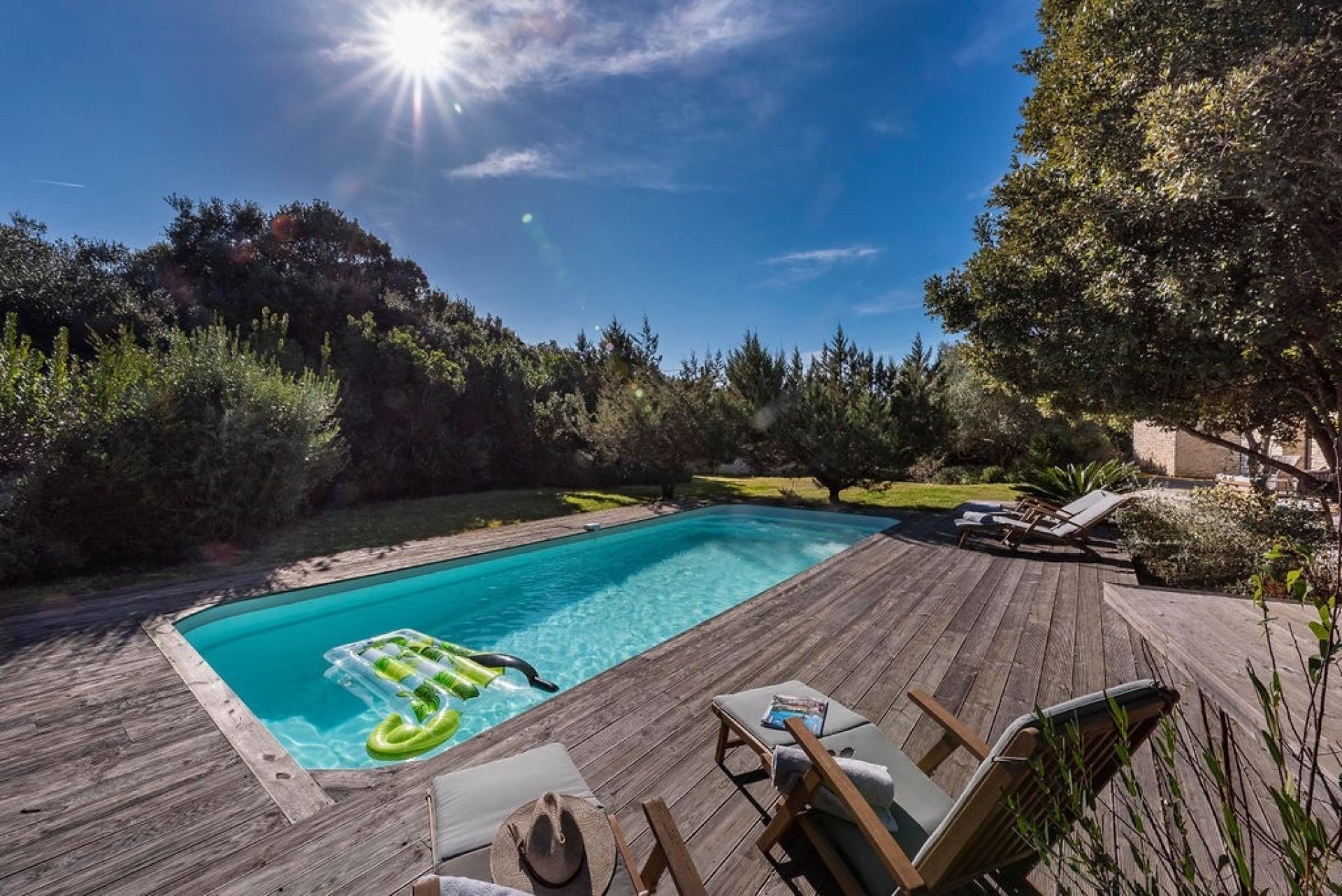Située proche du centre ville de Bonifacio, cette maison en pierres de 110 m² bénéficie d'un emplacement privilégié proche des criques et des plages de sable blanc, offrant un cadre exceptionnel. Érigée sur un terrain arboré de 1561 m² sans vis-à-vis, la propriété de plain-pied se distingue par ses matériaux nobles tels que le bois ancien, les véritables pierres de Bonifacio et la terre cuite. L'intérieur se compose d'une spacieuse pièce de vie avec cuisine équipée, de deux chambres avec salles de bain attenantes et toilettes pour l’une. De vastes terrasses avec cuisine d'été et piscine chauffée 10x4 invitent à la détente et à la convivialité. Cette bergerie comprend également la climatisation dans toutes les chambres et le salon, une buanderie extérieure, une zone de stationnement avec garage et un charmant jardin luxuriant aux essences endémiques créant une ambiance dépaysante.