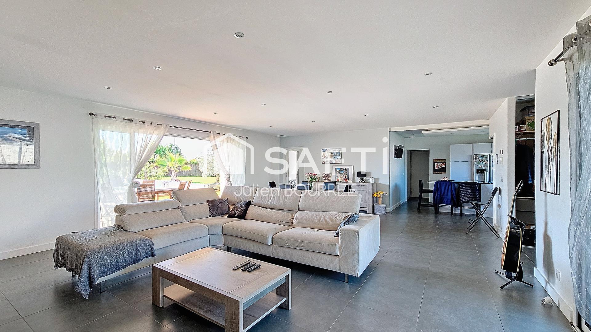 À l'intérieur, cette villa de plain pied de 161m2 offre un grand séjour, une cuisine ouverte équipée, 3 chambres avec placard, une salle de bain, une suite parentale avec salle d'eau, dressing et WC. Les 2 toilettes et 2 salles de bain offrent un confort optimal pour toute la famille avec une partie parentale et une partie enfant de part et d'autre de la maison. La climatisation, et la proximité de la gare plairont aux futurs propriétaires en quête de modernité et de praticité.