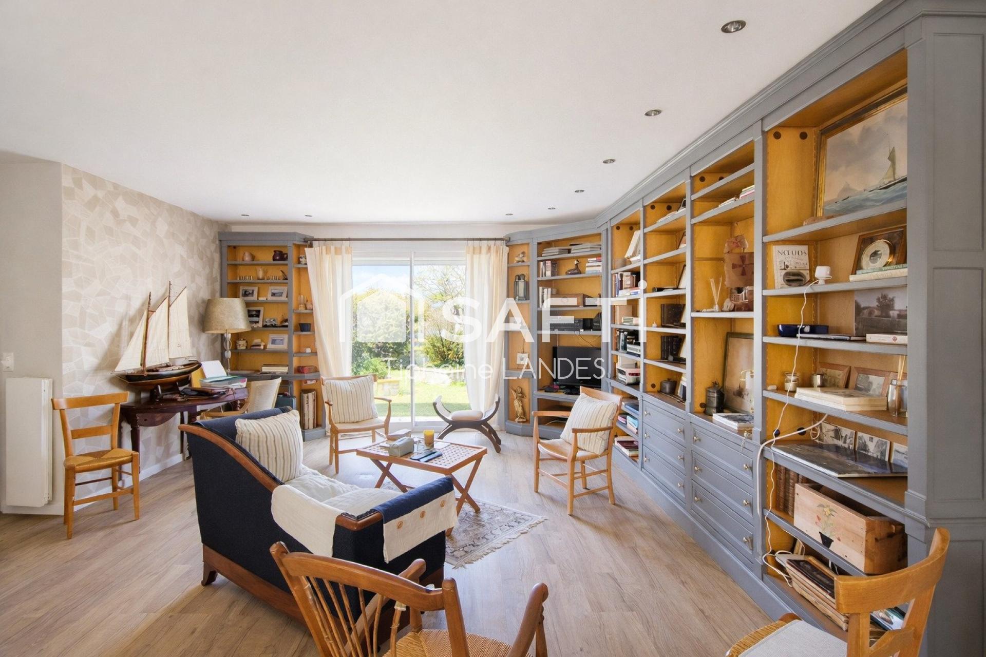La maison de 155 m² se compose d'une entrée qui s'ouvre sur un spacieux salon avec bibliothèque, un espace dinatoire et une cuisine ouverte entièrement équipée et un WC indépendant.