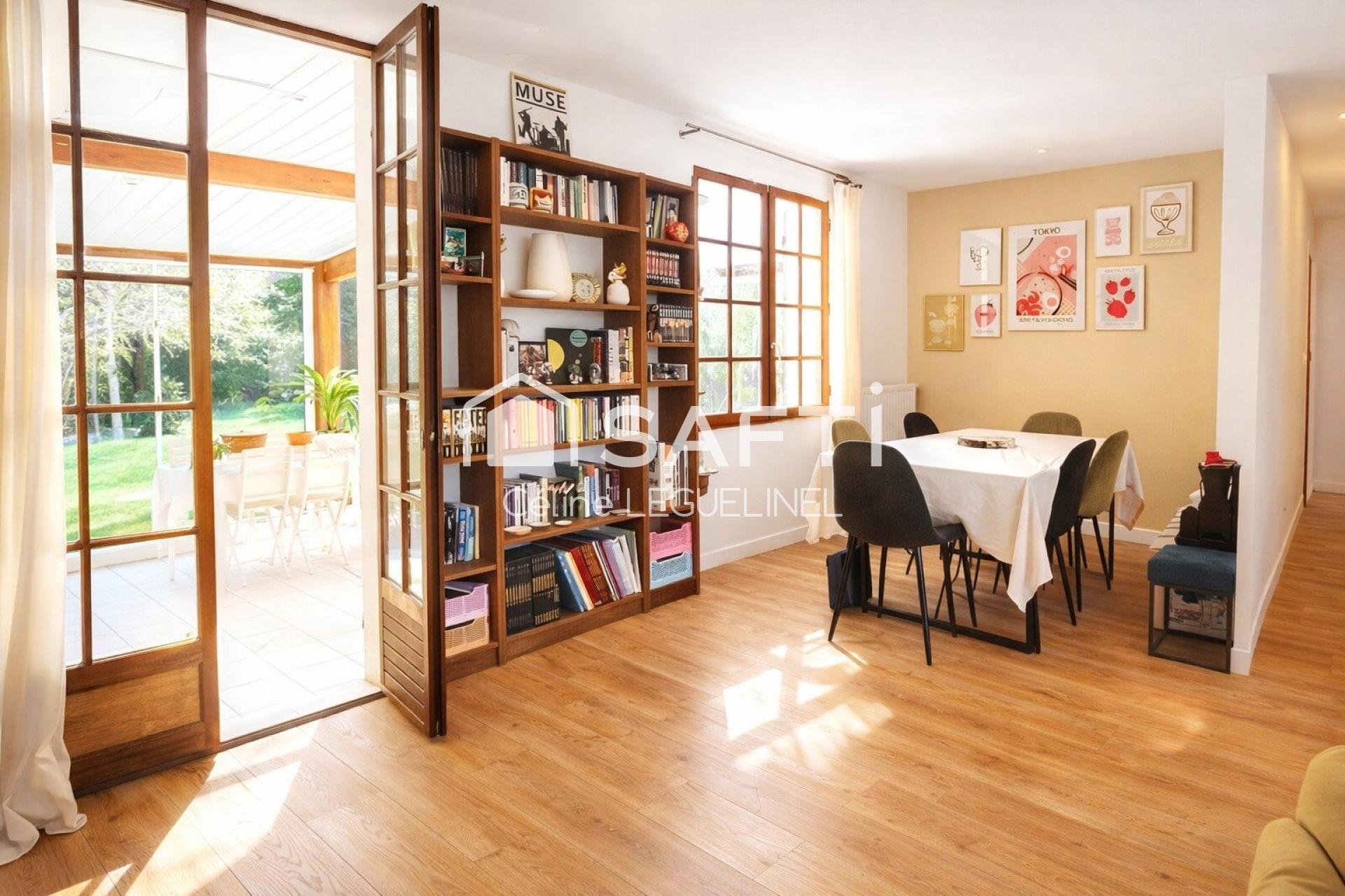 Maison familiale lumineuse avec poêle à bois, vie de plain-pied, sous-sol aménagé et grand jardin arboré, au calme à 10 min de Houdan.