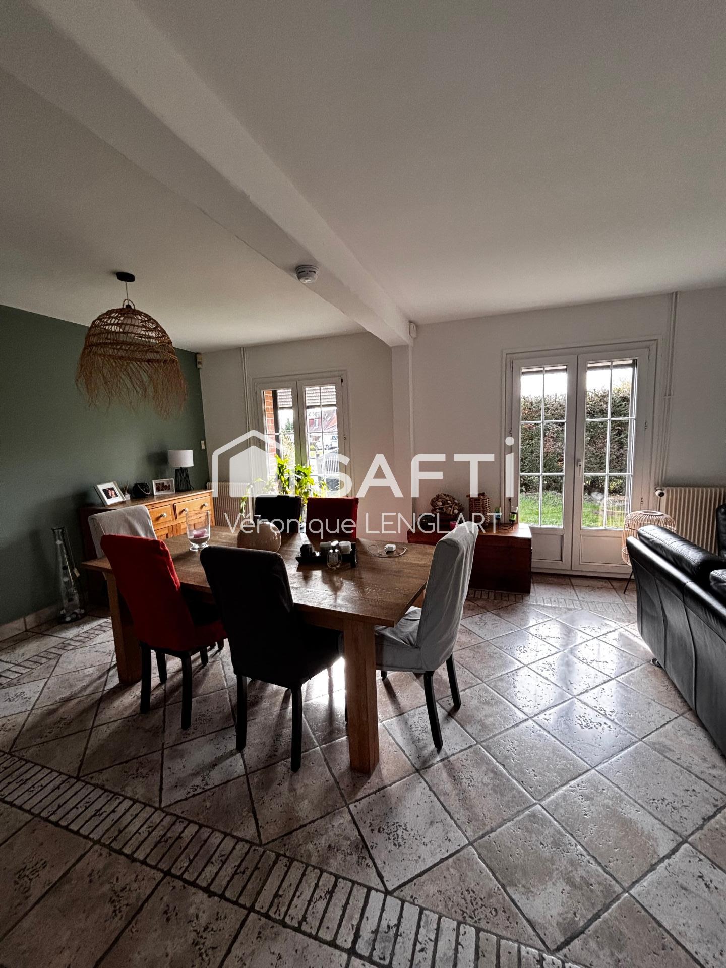 Située à Bouvignies, au cœur de la campagne de la Pévèle, cette maison offre un cadre de vie paisible. À seulement 5 minutes de l’A23 et d’Orchies, elle bénéficie d’un accès rapide à la gare d’Orchies et d’un arrêt de bus à quelques mètres, desservant collèges et lycées.