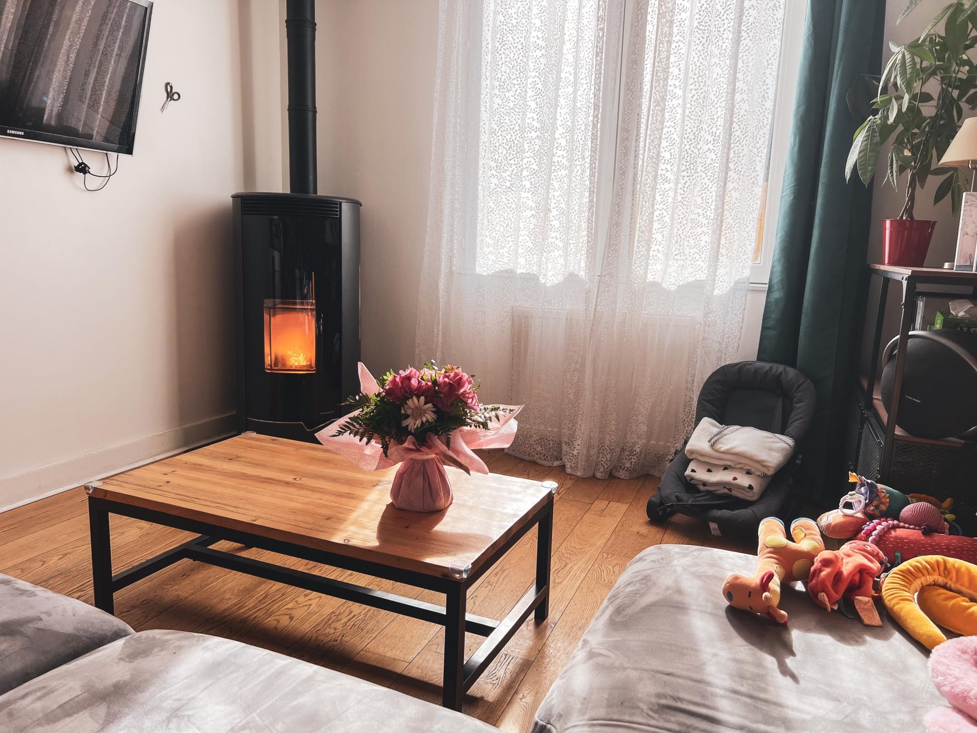 Cette partie accueille également une belle salle de bain équipée d’une douche et d’une baignoire, sublimée par un puits de lumière avec Velux, ainsi qu’une grande chambre parentale de 15 m². L’habitation a bénéficié d’une rénovation complète avec isolation performante et chauffage au gaz complété par un poêle à granulés Palazzetti récent (2022), avec menuiseries modernes en PVC et aluminium.