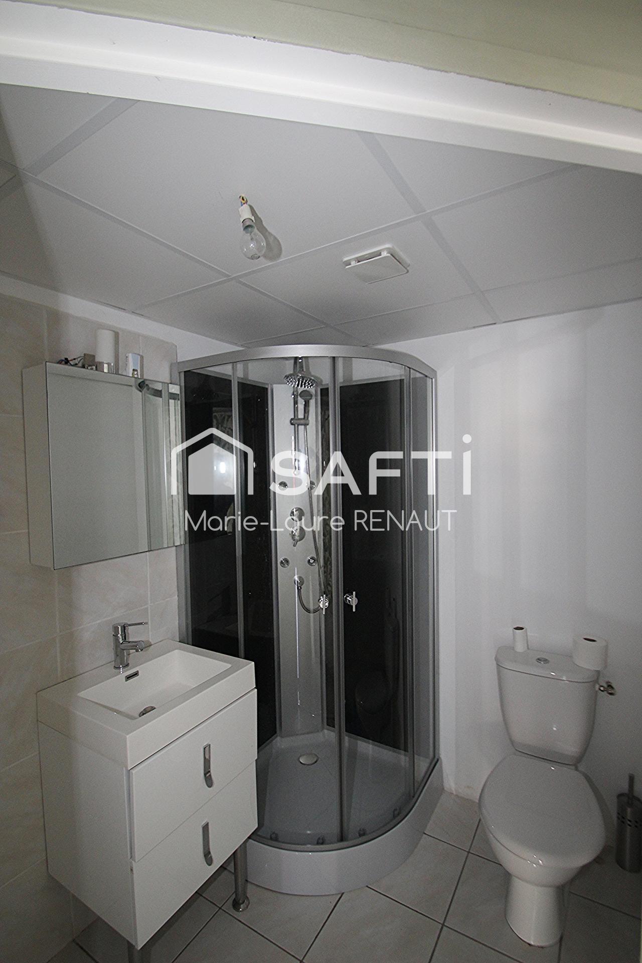 Dès l’entrée, on découvre une cuisine entièrement rénovée, moderne et accueillante, pensée comme un véritable lieu de vie avec son coin repas. L’ambiance est chaleureuse, on s’y projette facilement. Dans son prolongement, une salle d’eau avec toilettes, puis un séjour confortable qui invite à se poser et à profiter d’un intérieur fonctionnel.