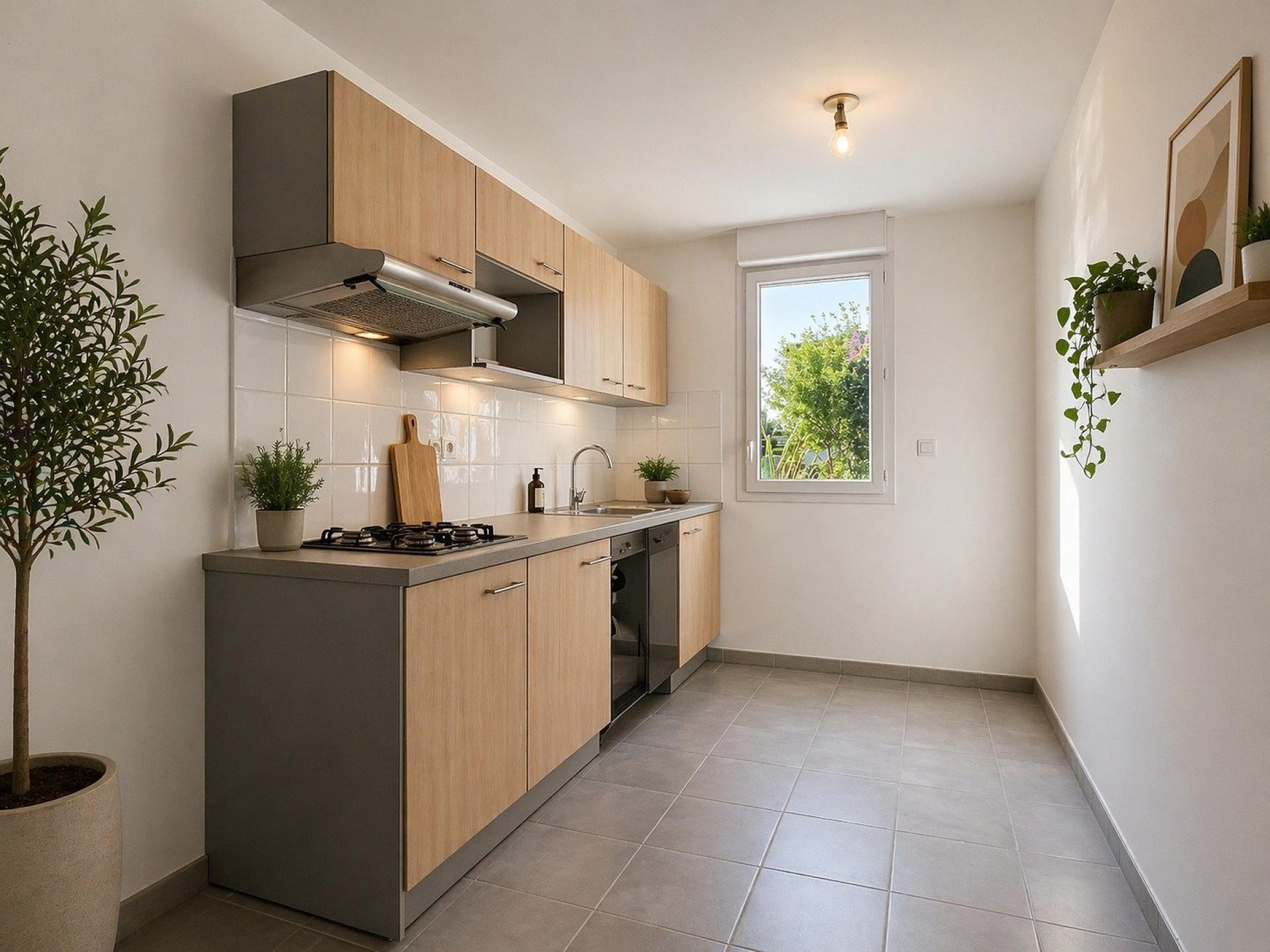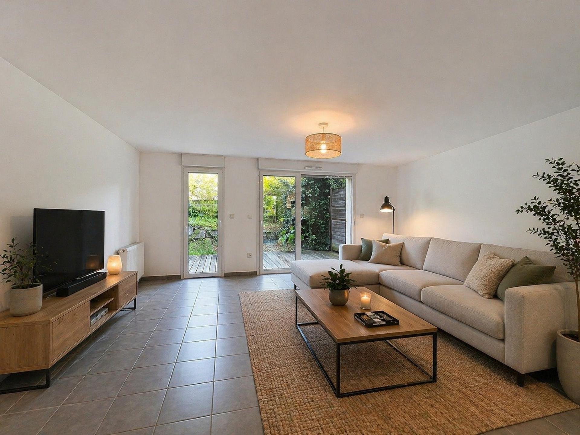 Dès l’entrée, vous accédez à un sas d’entrée fonctionnel intégrant une buanderie avec WC, un véritable atout pour le quotidien. Vous poursuivez ensuite sur une belle pièce de vie lumineuse d'environ 40 m² avec cuisine aménagée et ouverte sur le salon/séjour, créant un espace convivial et agréable à vivre. Cet ensemble s’ouvre directement sur une terrasse et un jardinet privatif, idéals pour profiter des beaux jours en toute tranquillité.