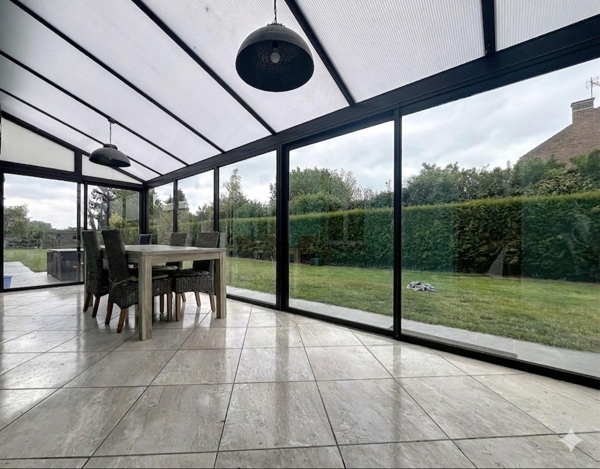Pour profiter de la vue sur le jardin en toute saison, une vaste véranda baignée de lumière prolonge l'espace de vie vers l'extérieur.