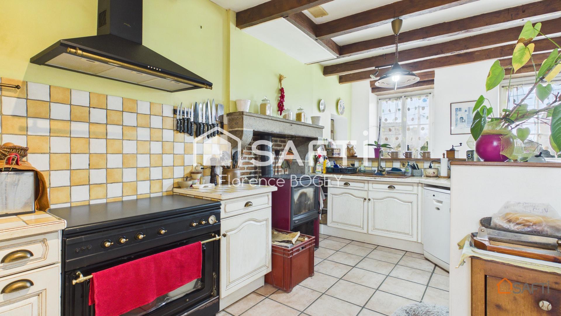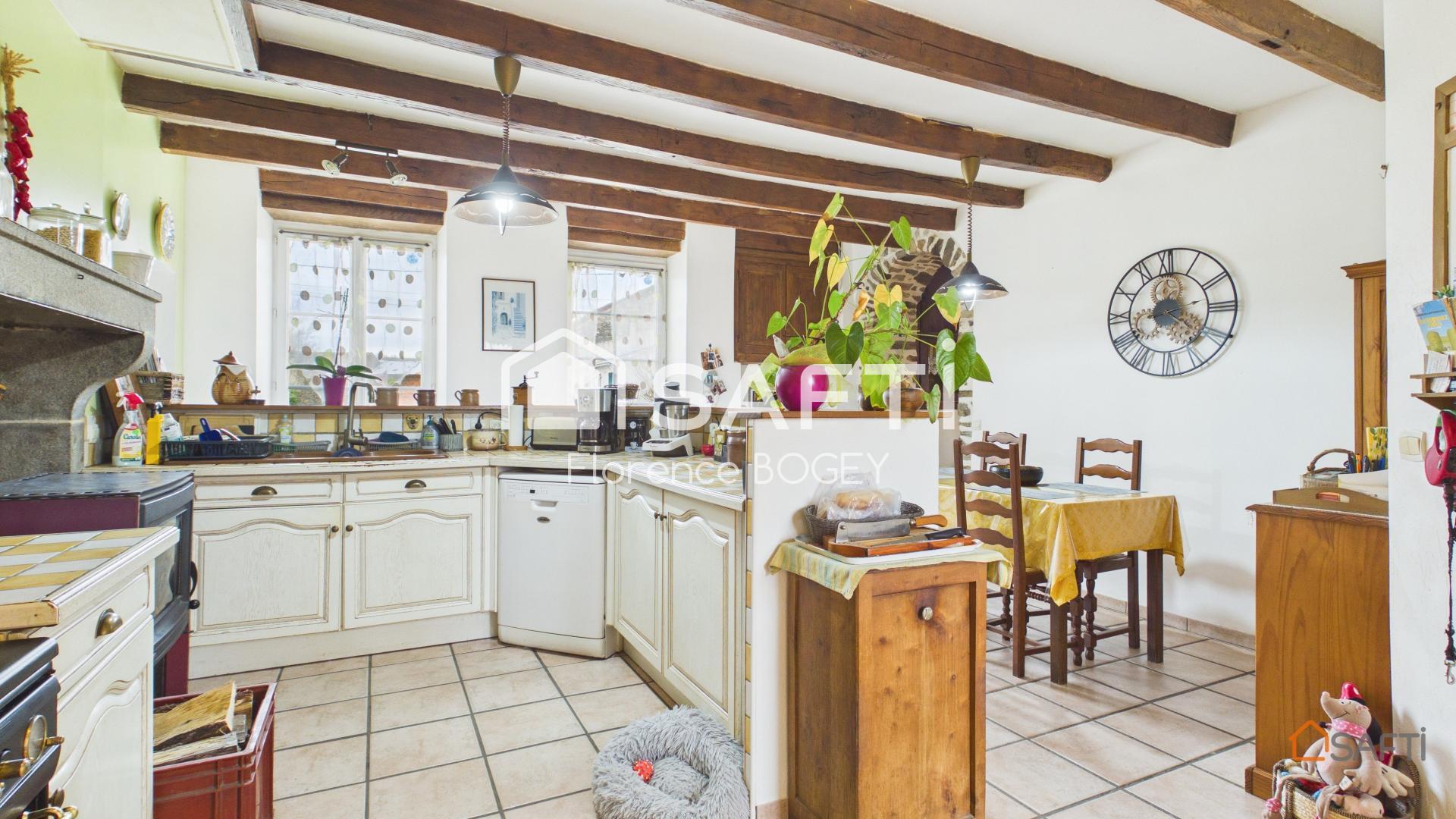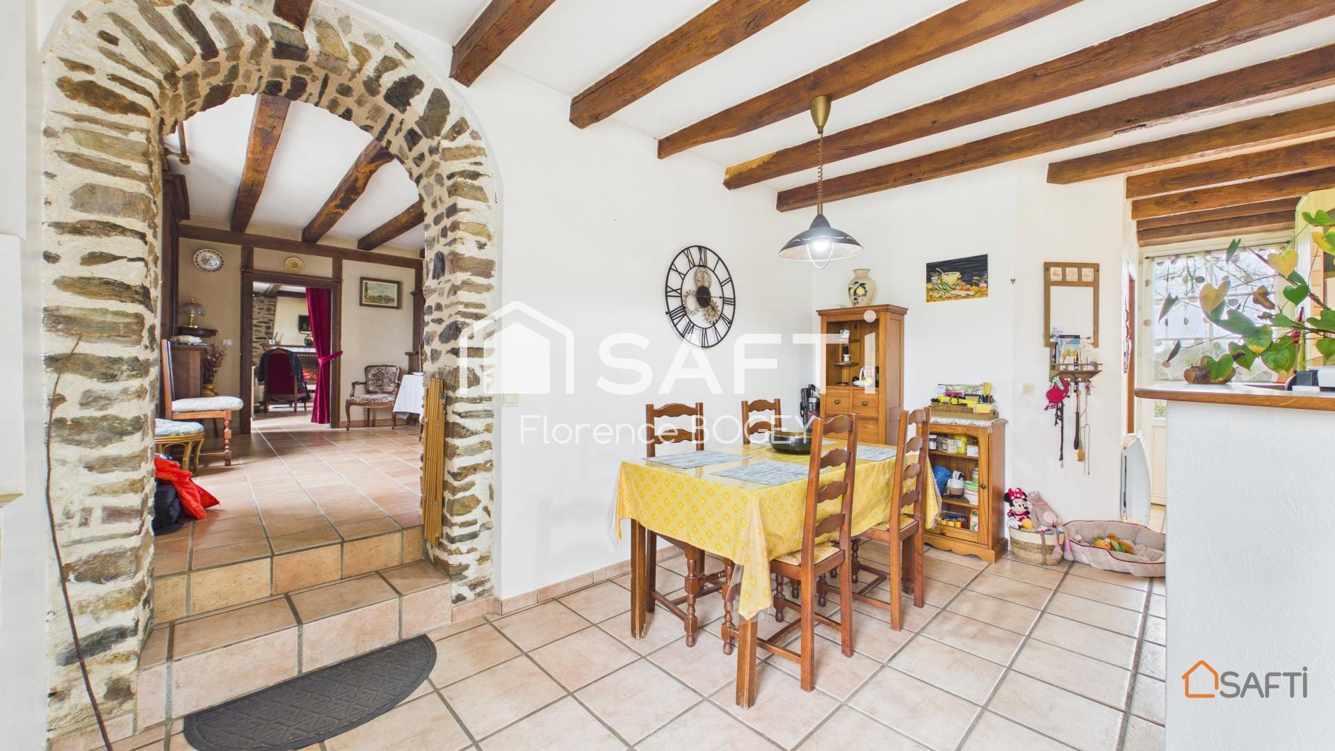 D’une surface habitable d’environ 164 m², la maison a été entretenue avec soin et conserve tout le cachet de l’ancien. Les poutres apparentes, la pierre et les volumes généreux créent une ambiance authentique et accueillante.