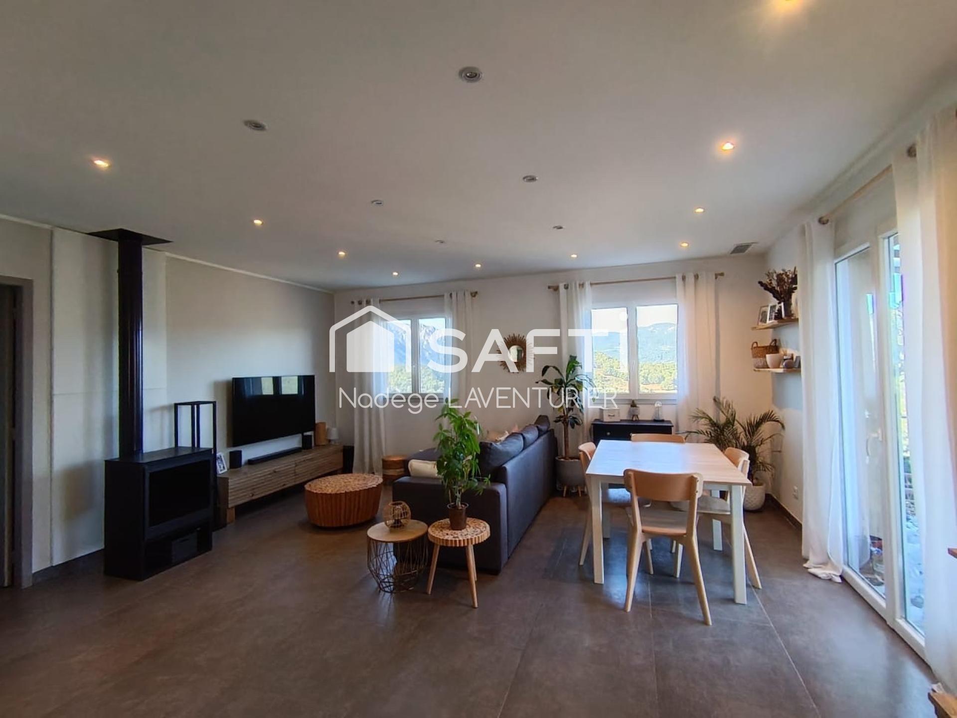 À l’étage, un appartement d’environ 79 m² rénové en 2022 comprenant séjour lumineux, cuisine équipée, cellier, deux chambres avec salles d’eau privatives, WC indépendant, climatisation gainable et poêle à bois. Une terrasse avec pergola offre une agréable vue dégagée.