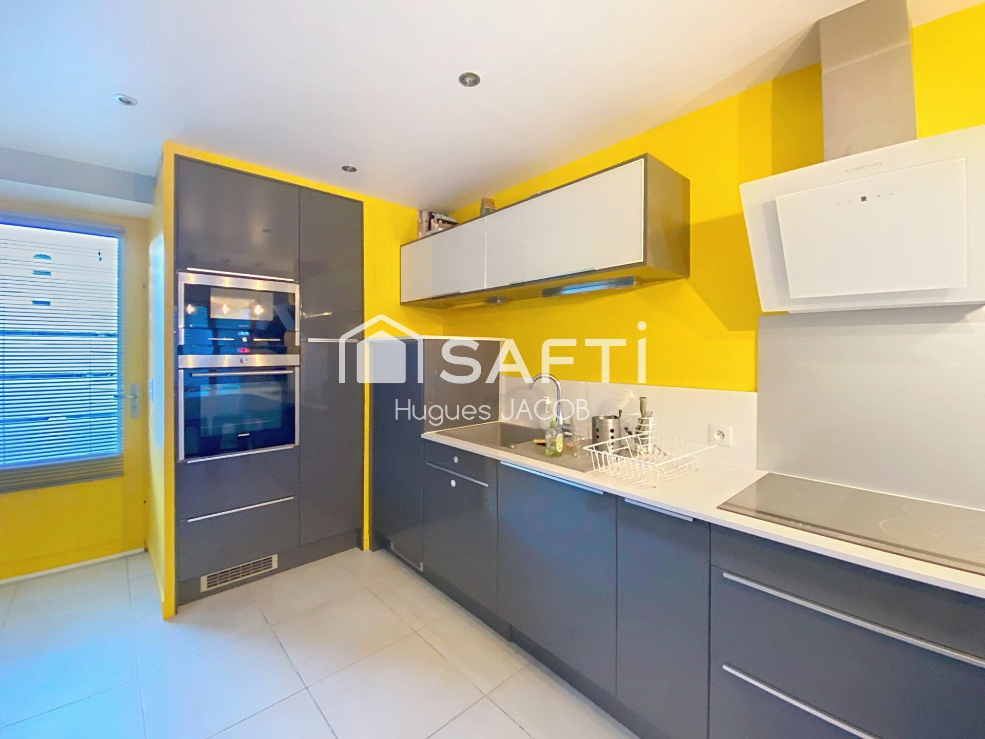 Au rez-de-chaussée : un salon, une cuisine semi-ouverte aménagée et équipée, un séjour, une buanderie avec de nombreux rangements et un wc indépendant.