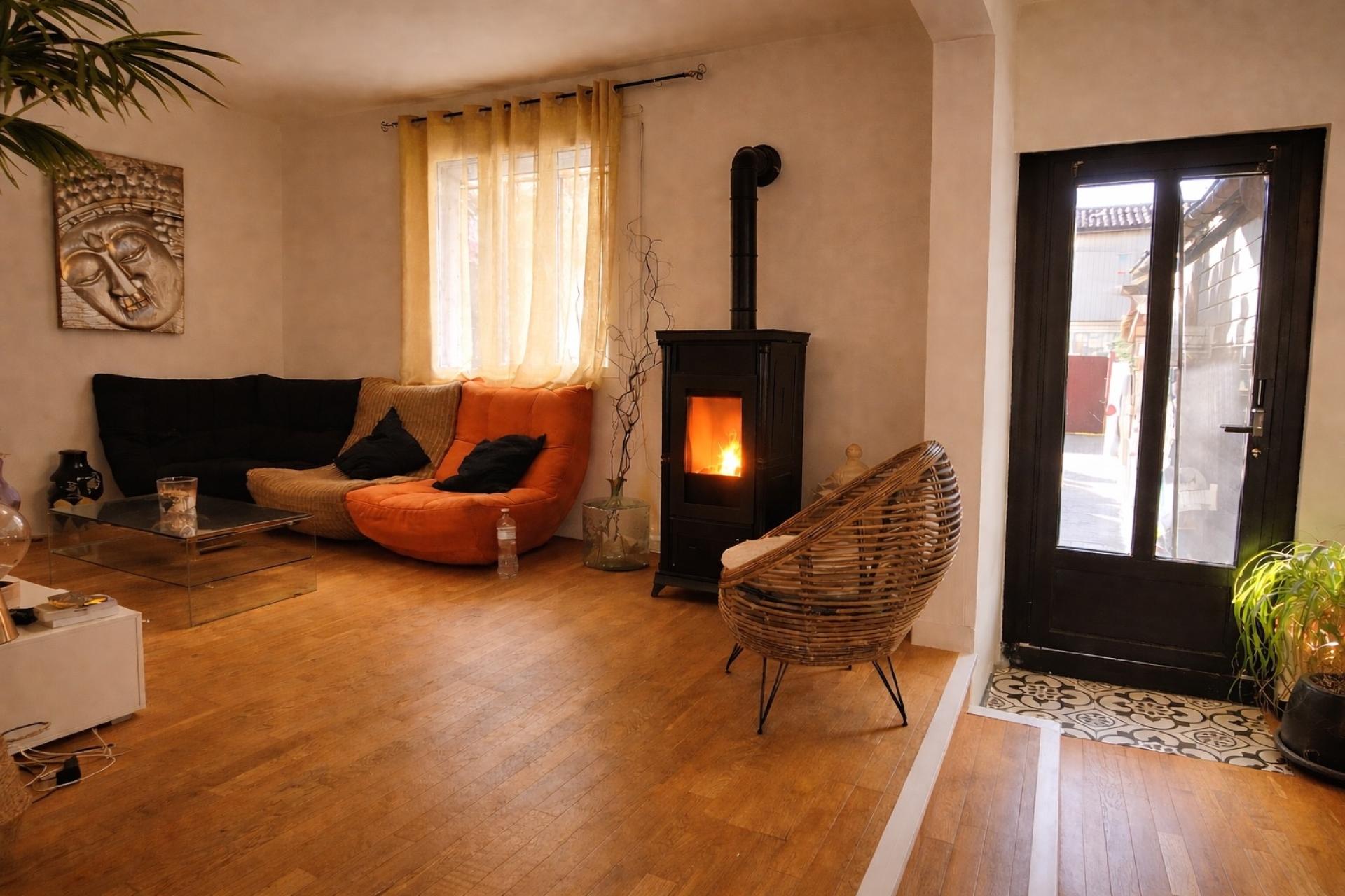 Dès l’entrée, l’atmosphère chaleureuse s’impose avec un séjour accueillant, sublimé par une ancienne cheminée décorative qui confère authenticité et caractère. L’espace repas s’ouvre naturellement sur une cuisine fonctionnelle, formant une pièce de vie conviviale et équilibrée.