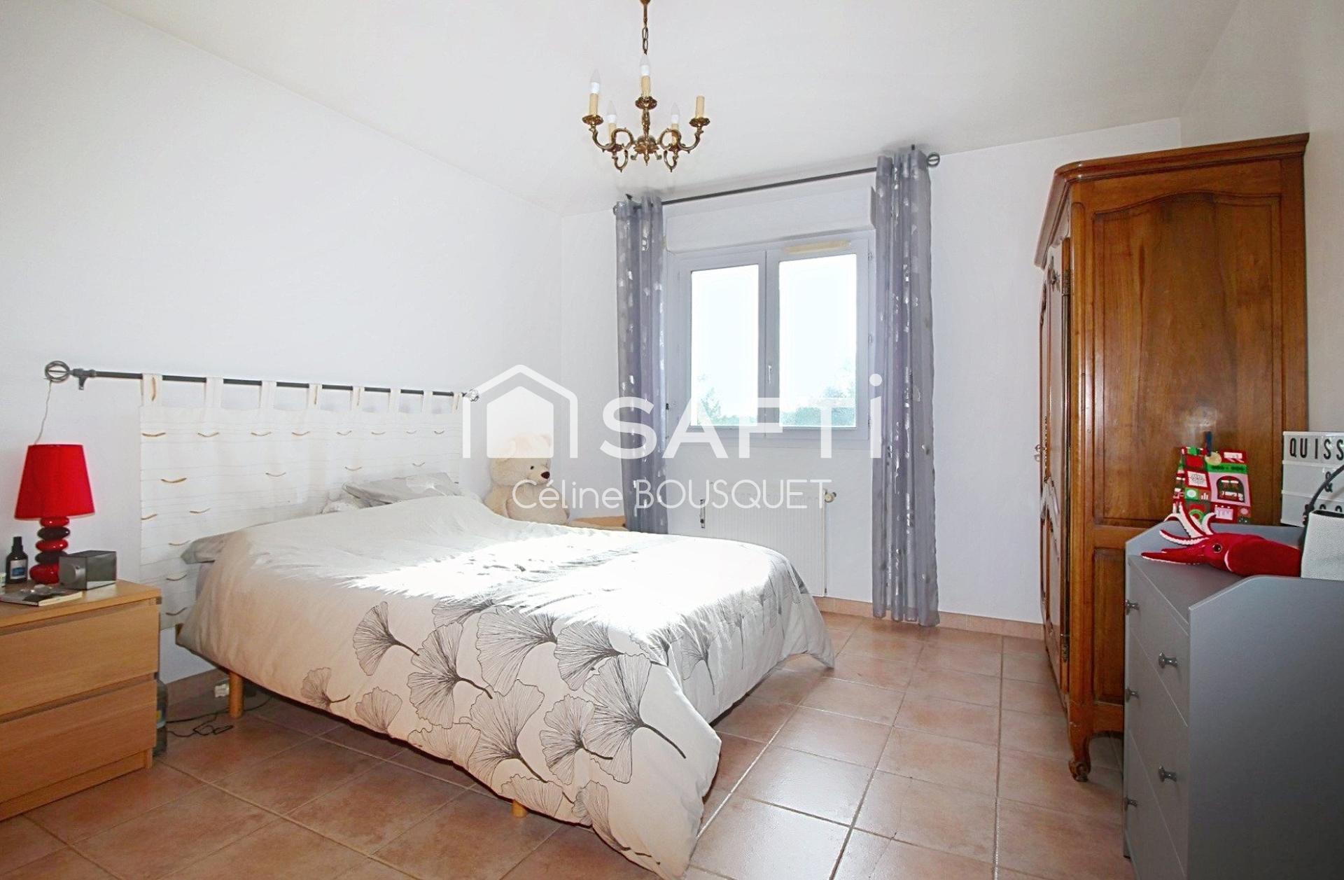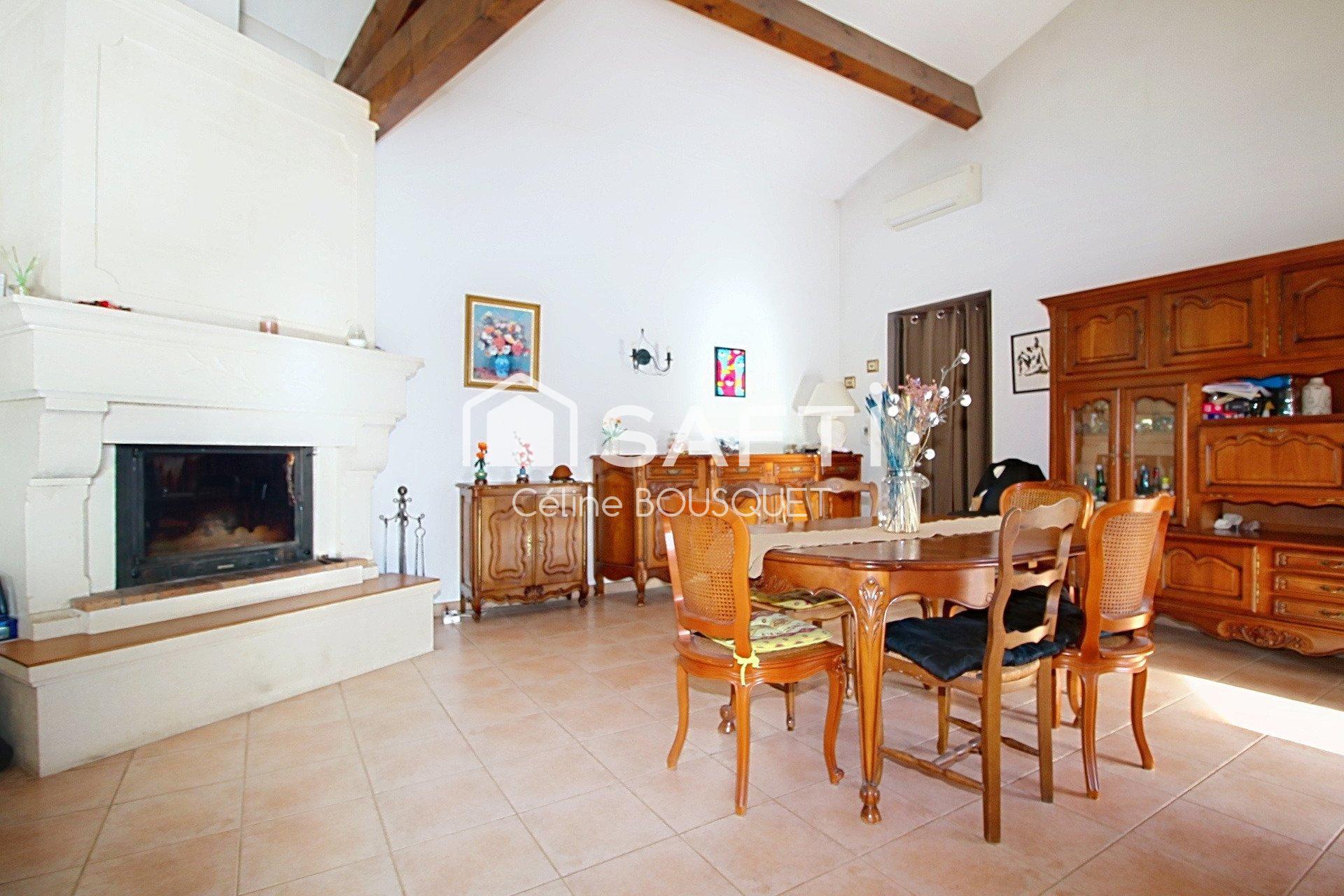 A l'intérieur : une entrée dessert un vaste séjour avec sa cheminée à insert, donnant sur une terrasse baignée de lumière, une cuisine toute équipée, trois chambres avec placard, un cellier/dressing, une salle de bains (douche et baignoire) et WC séparé.