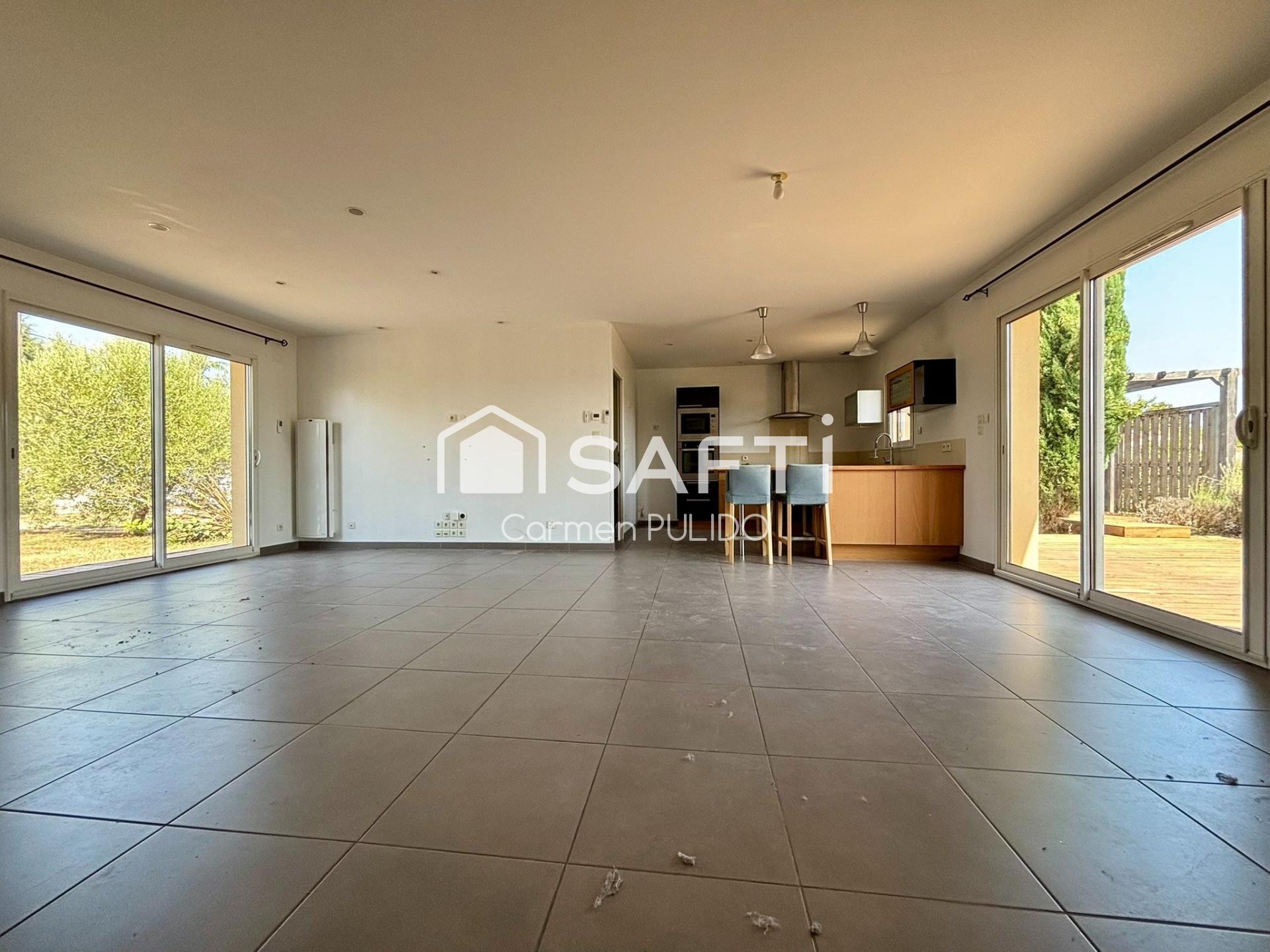 Maison contemporaine de plain-pied : 3 chambres, piscine, jardin, à proximité immédiate des commodités.