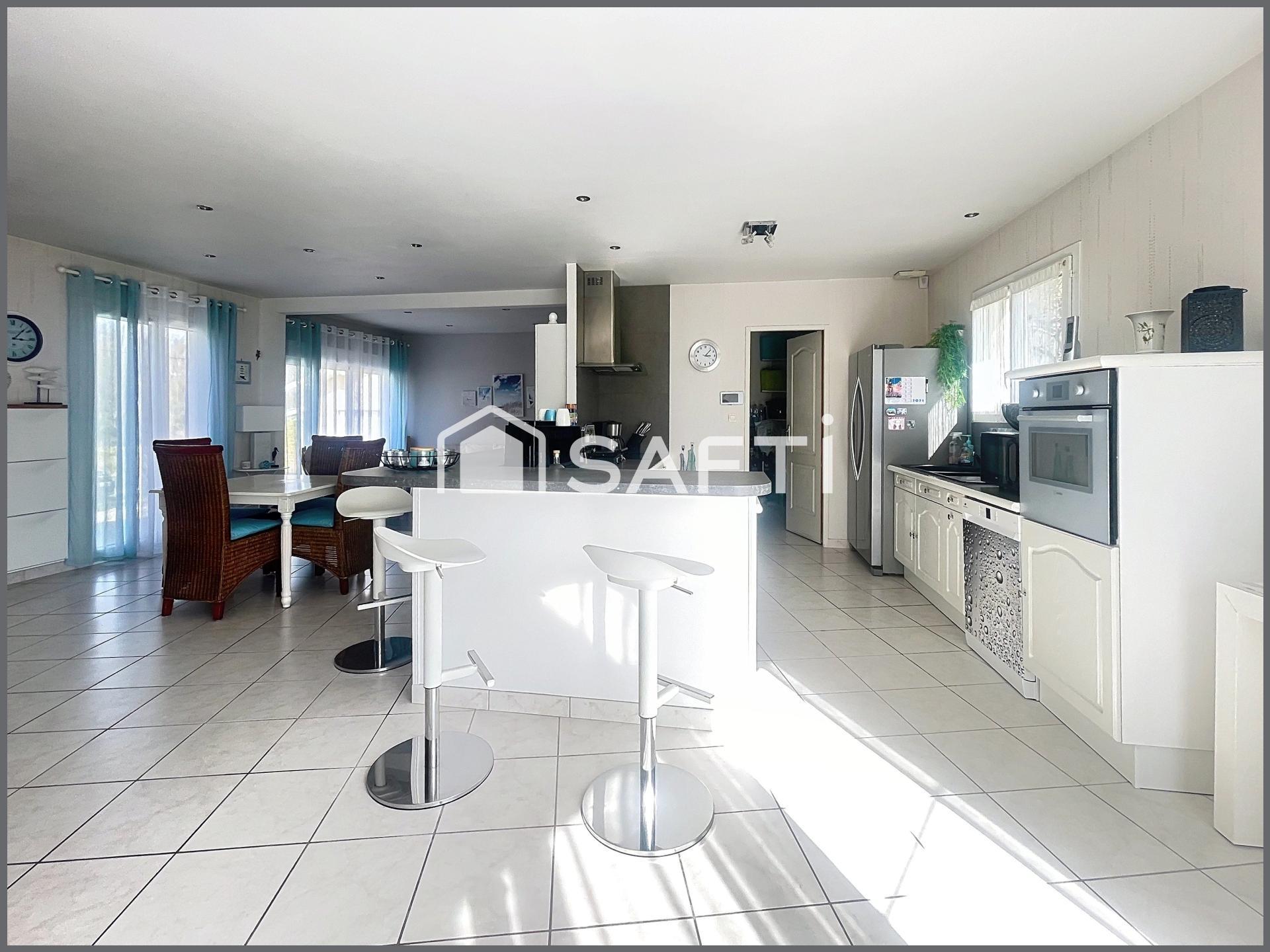 À l'intérieur, vous trouverez 1 séjour lumineux avec cuisine toute équipée, d'un grand cellier, de 3 chambres dotées de placards, d'une salle de bain moderne avec douche à l'italienne et baignoire, ainsi que d'un WC séparé. Les équipements tels que la climatisation réversible, la pompe à chaleur, le poêle canadien, la fibre, l'interphone, le portail électrique viennent parfaire le confort et la fonctionnalité de cette charmante maison.