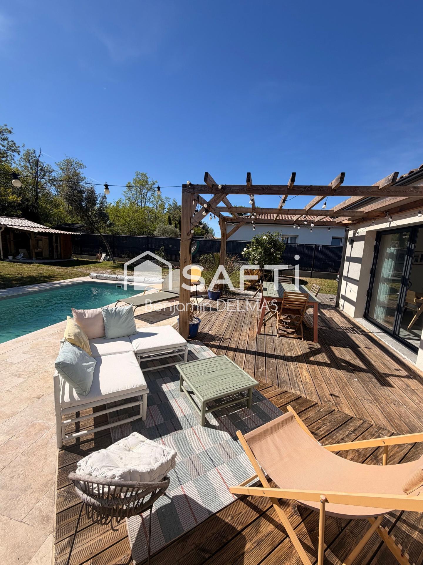 Implantée sur une parcelle de 816 m², vous profiterez d’un extérieur agréable avec piscine, idéal pour les beaux jours.