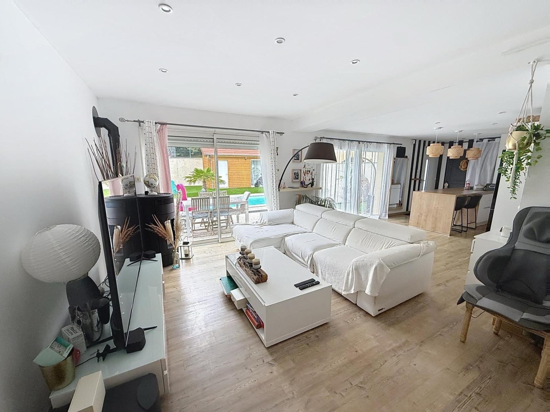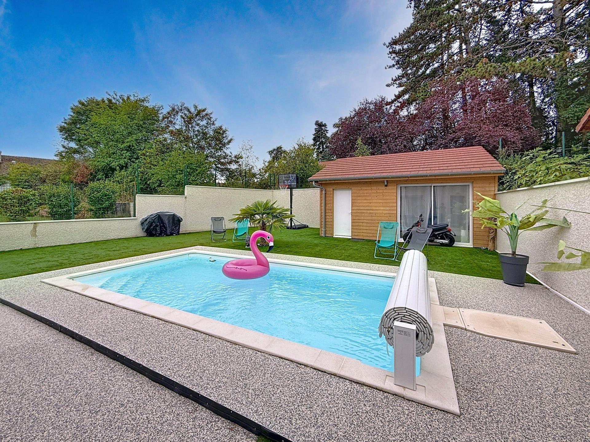 À l’extérieur, le terrain entièrement clos et parfaitement entretenu accueille une piscine récente équipée d’un rideau motorisé et d’une pompe à chaleur, une vaste terrasse en moquette de pierre ainsi que trois places de stationnement extérieures. Une dépendance isolée d’environ 16 m², dotée de l’électricité, offre de multiples possibilités : studio indépendant, espace de loisirs ou activité professionnelle.